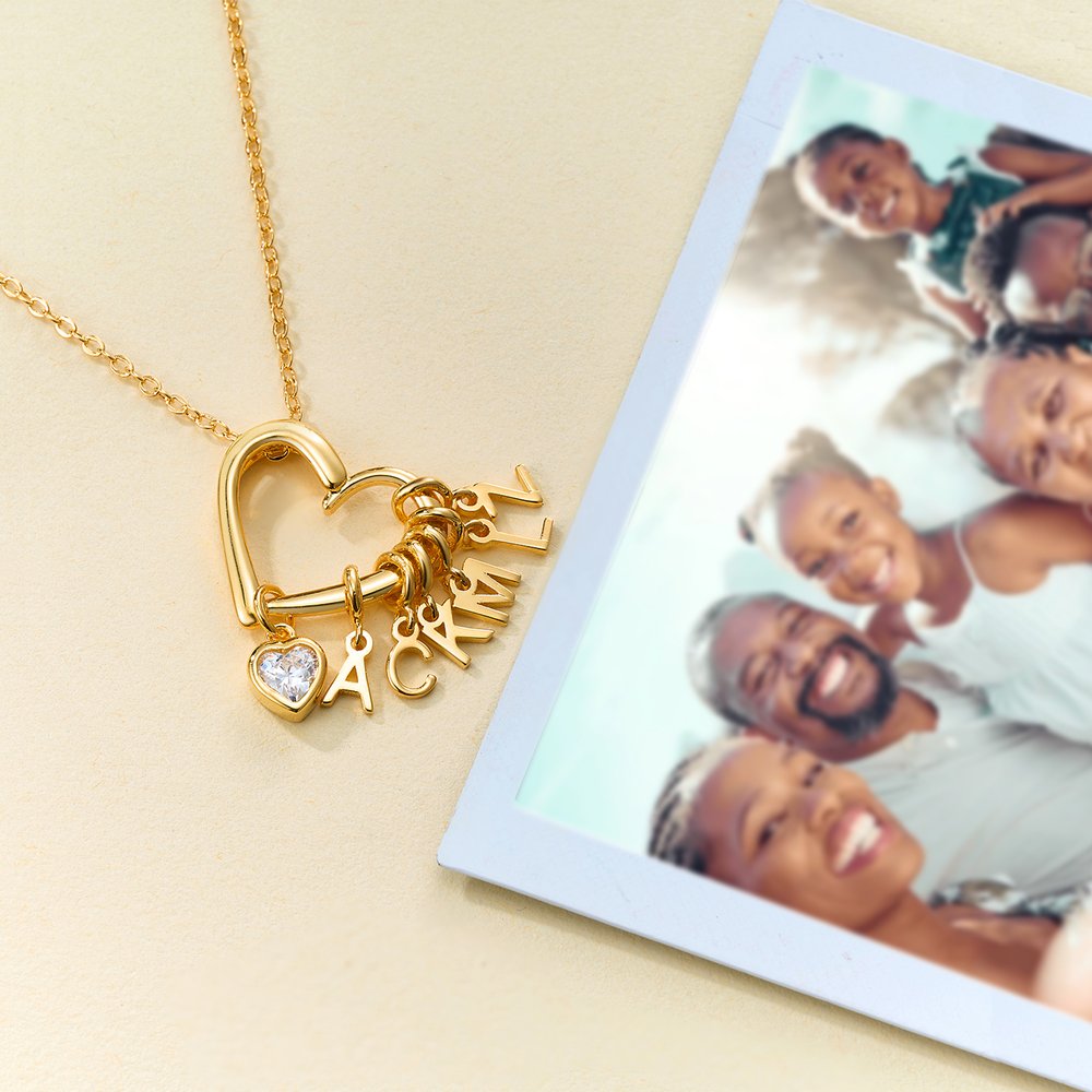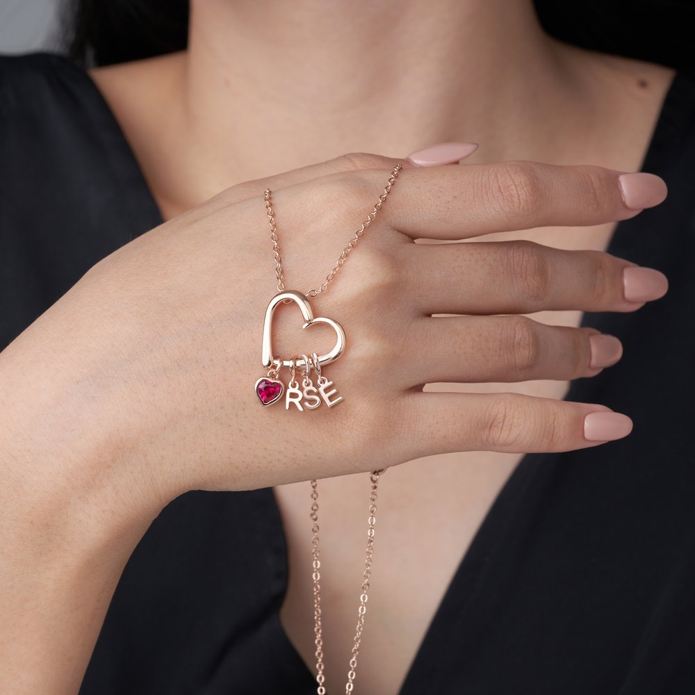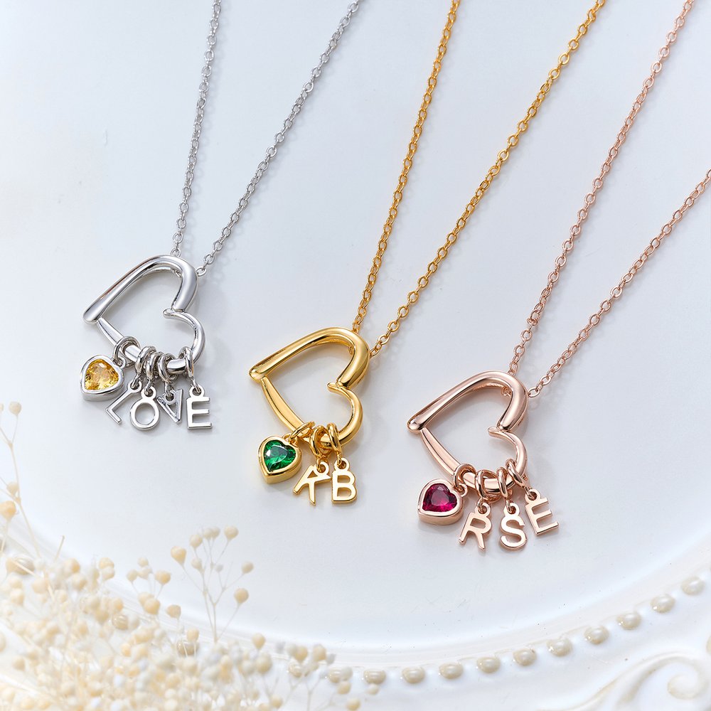 Each has a heart-shaped main pendant, paired with a small heart-shaped birthstone charm and customizable letter pendants. The chains are delicate, creating an elegant and unified look. You can select materials like brass and silver. Choose a birthstone for any month, and add 1 to 6 initials of loved ones.