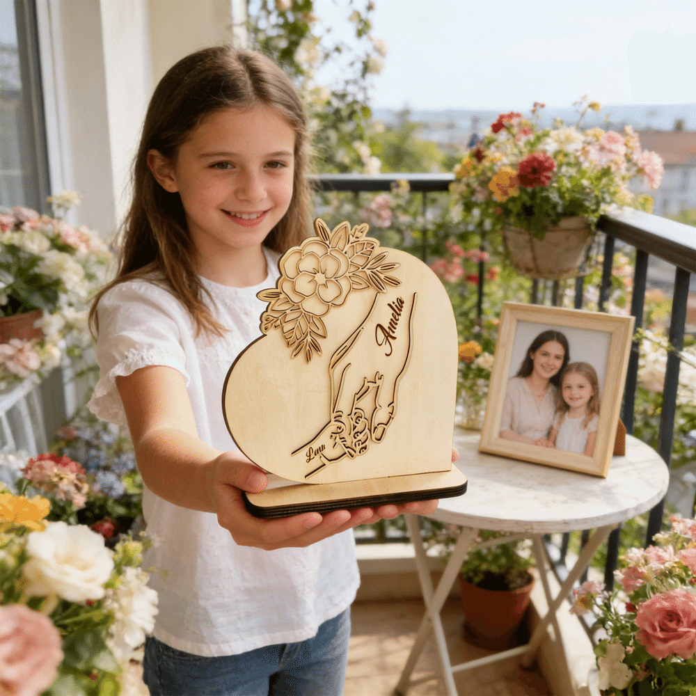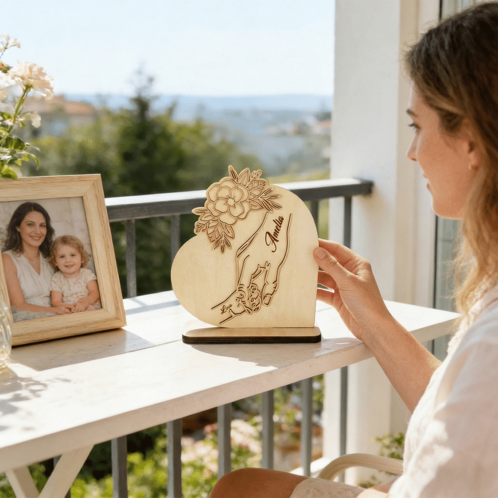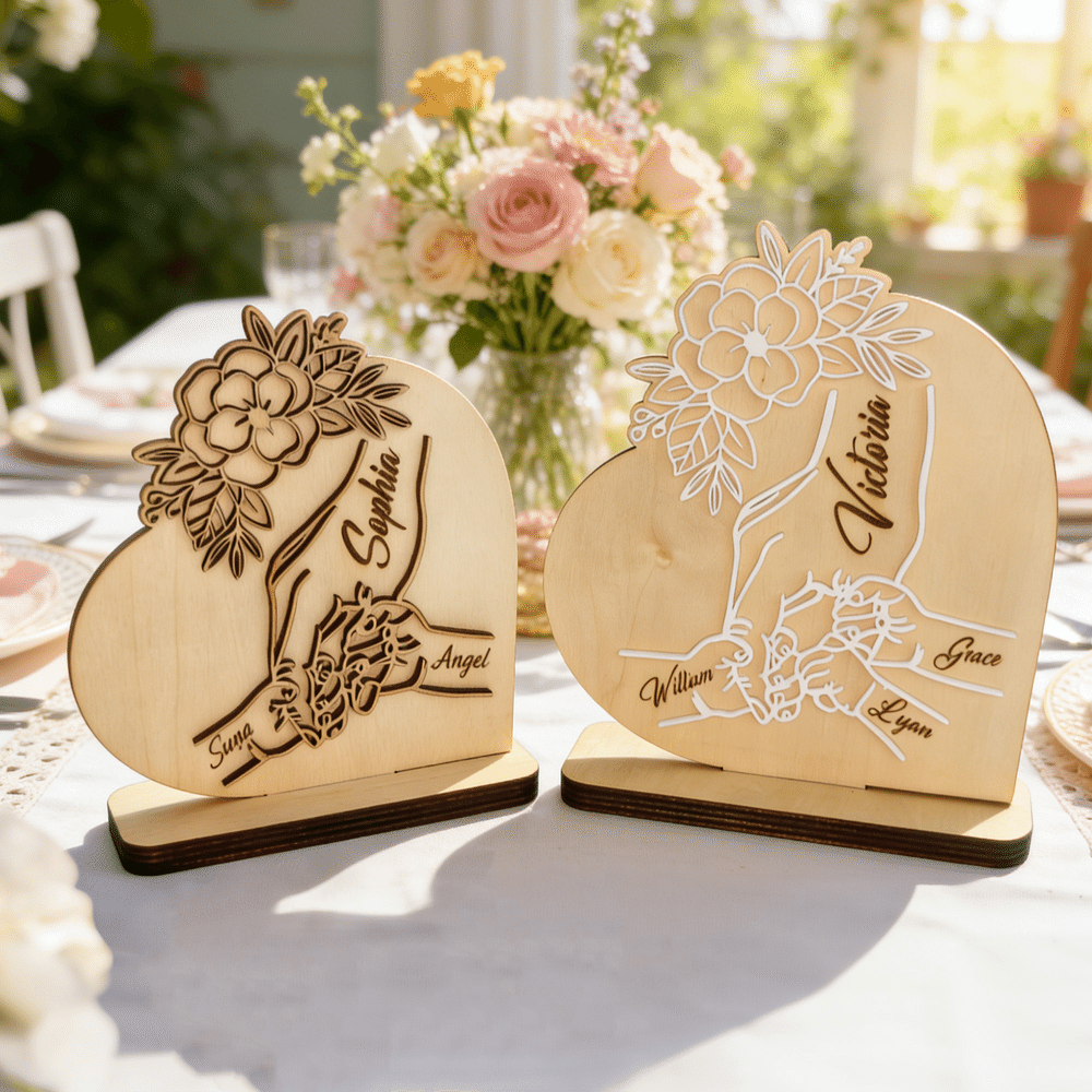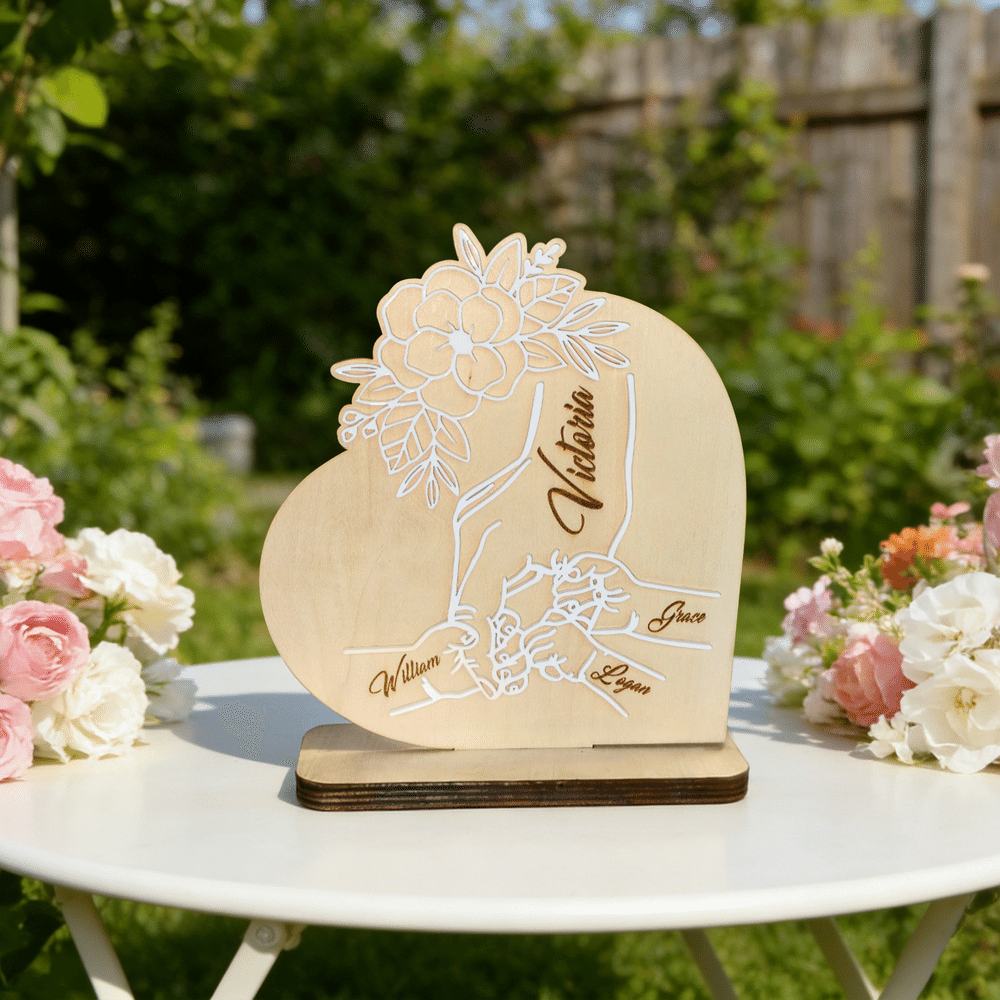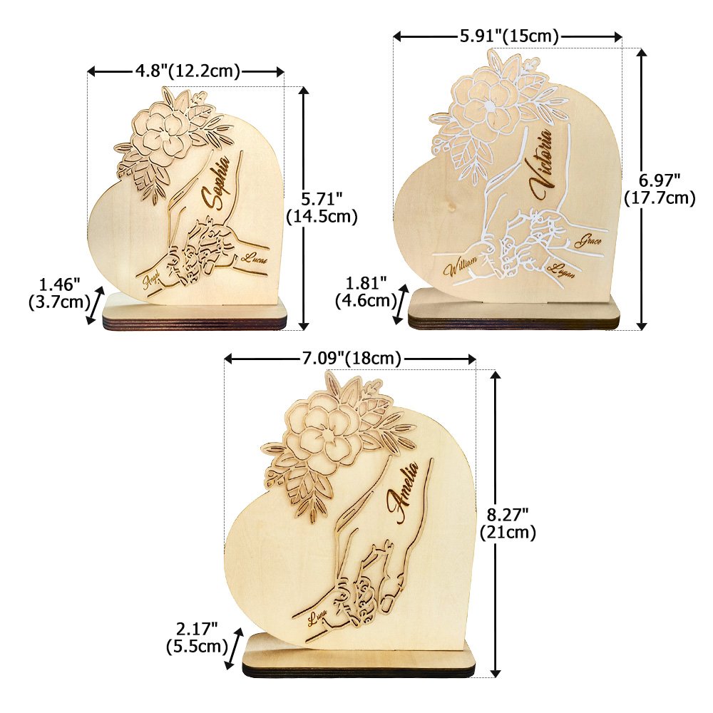 Denne hjerteformede trefiguren har et varmt motiv av en større hånd som holder noen mindre hender, med blomster- og bladdekorasjoner i lag - mykt og helende. Den kan tilpasses med antall hender som holdes og et personlig navn, og passer til ulike familiebånd som foreldre-barn eller besteforeldre-barnebarn. Det gir liv til de vakre symbolene beskyttelse, fellesskap og vekst, og gjør hvert enkelt produkt til et unikt minne om familiens varme.