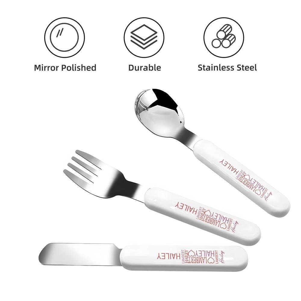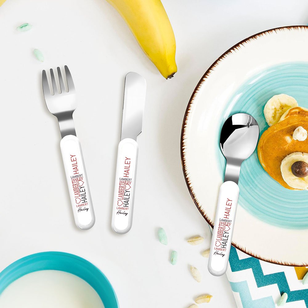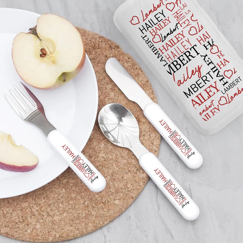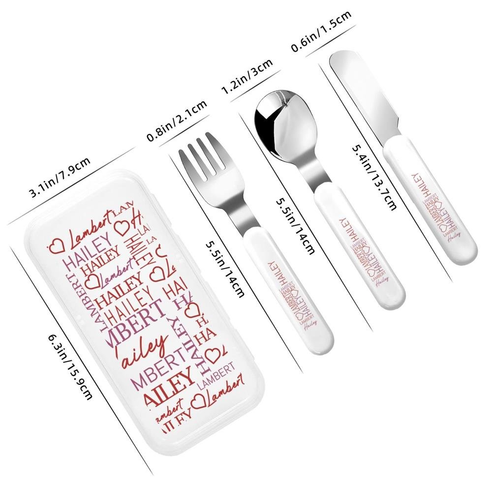 Dette serviset har myke toner og interessante skrifttyper. Navnene er ordnet i ulike skrifttyper og er utsmykket med kjærlighetsmønstre for å skape en livlig atmosfære. Enten det er en gaffel, skje, kniv eller en bærbar oppbevaringsboks, kan du trykke navnet ditt for å skape et servise som virkelig tilhører barnet ditt.