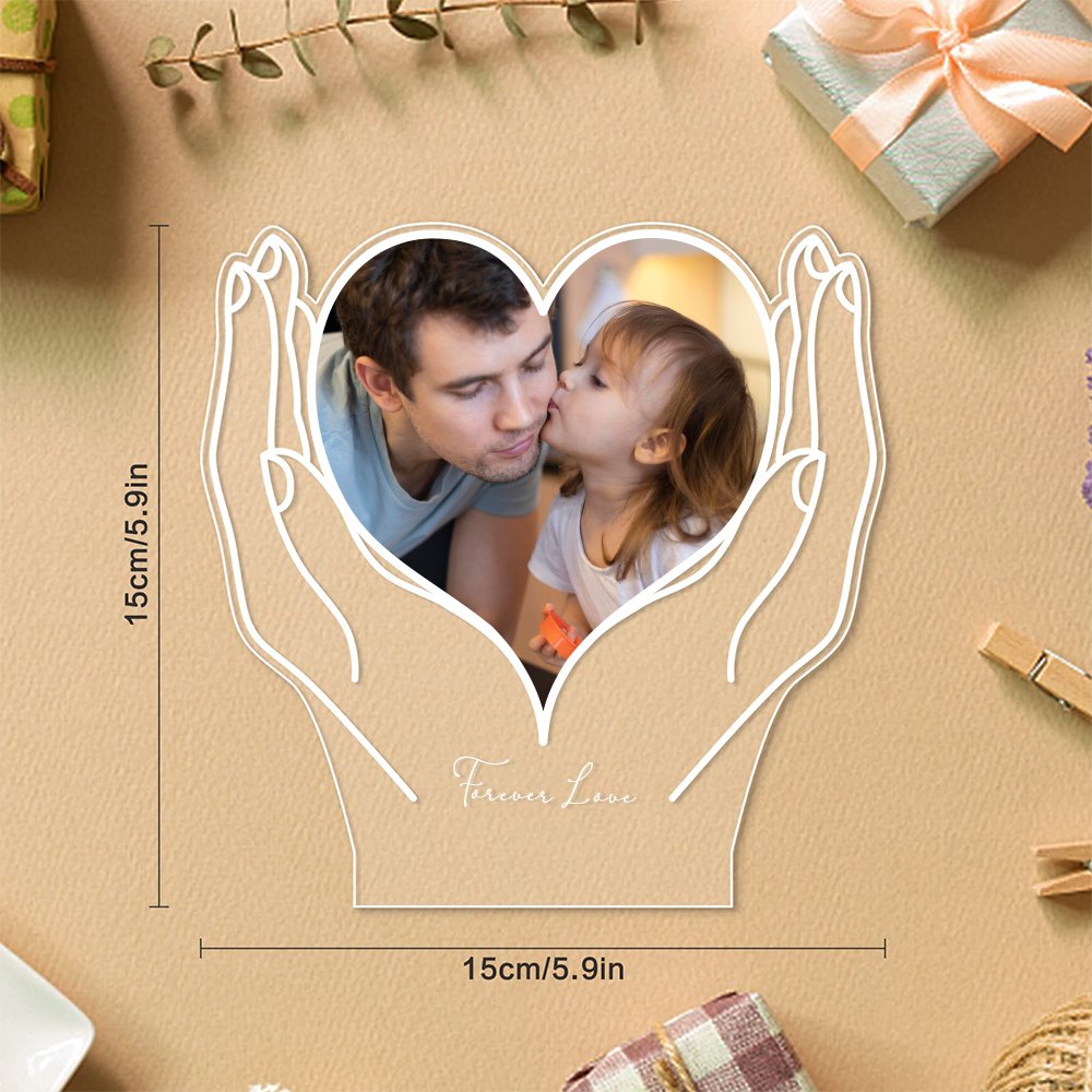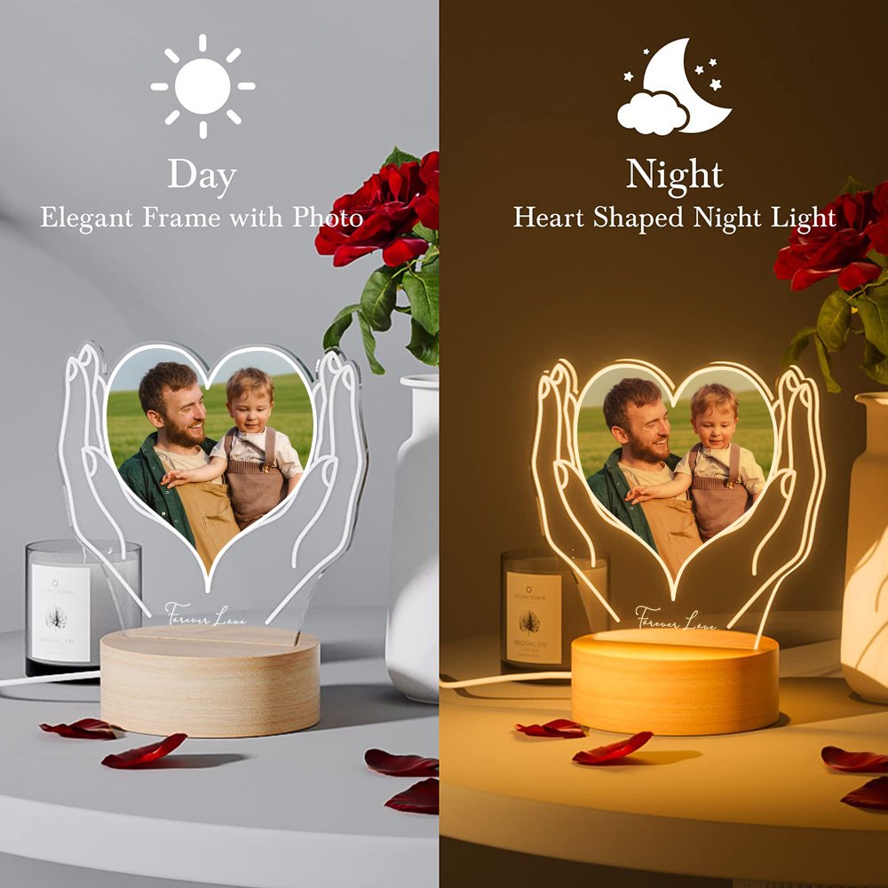 This night light elegantly showcases a pair of hands holding a heart, within which a personalized photo capturing treasured memories can be viewed. A warm and heartfelt text can also be customized at the bottom, making this a distinctive and unforgettable gift.