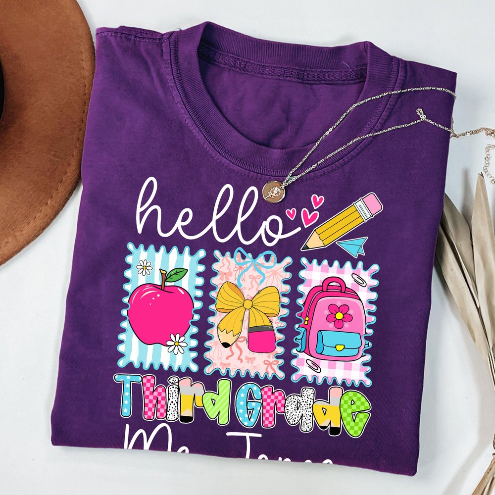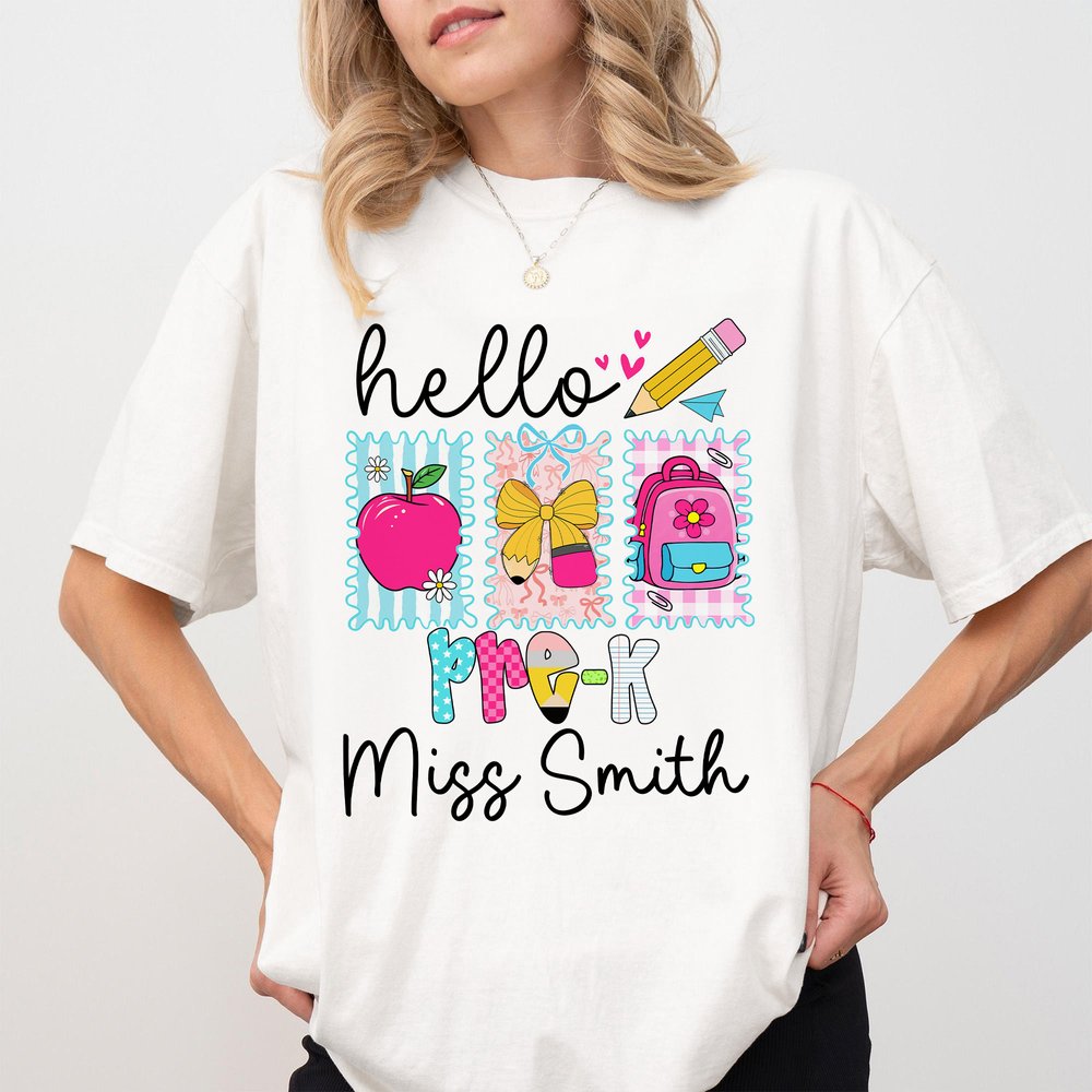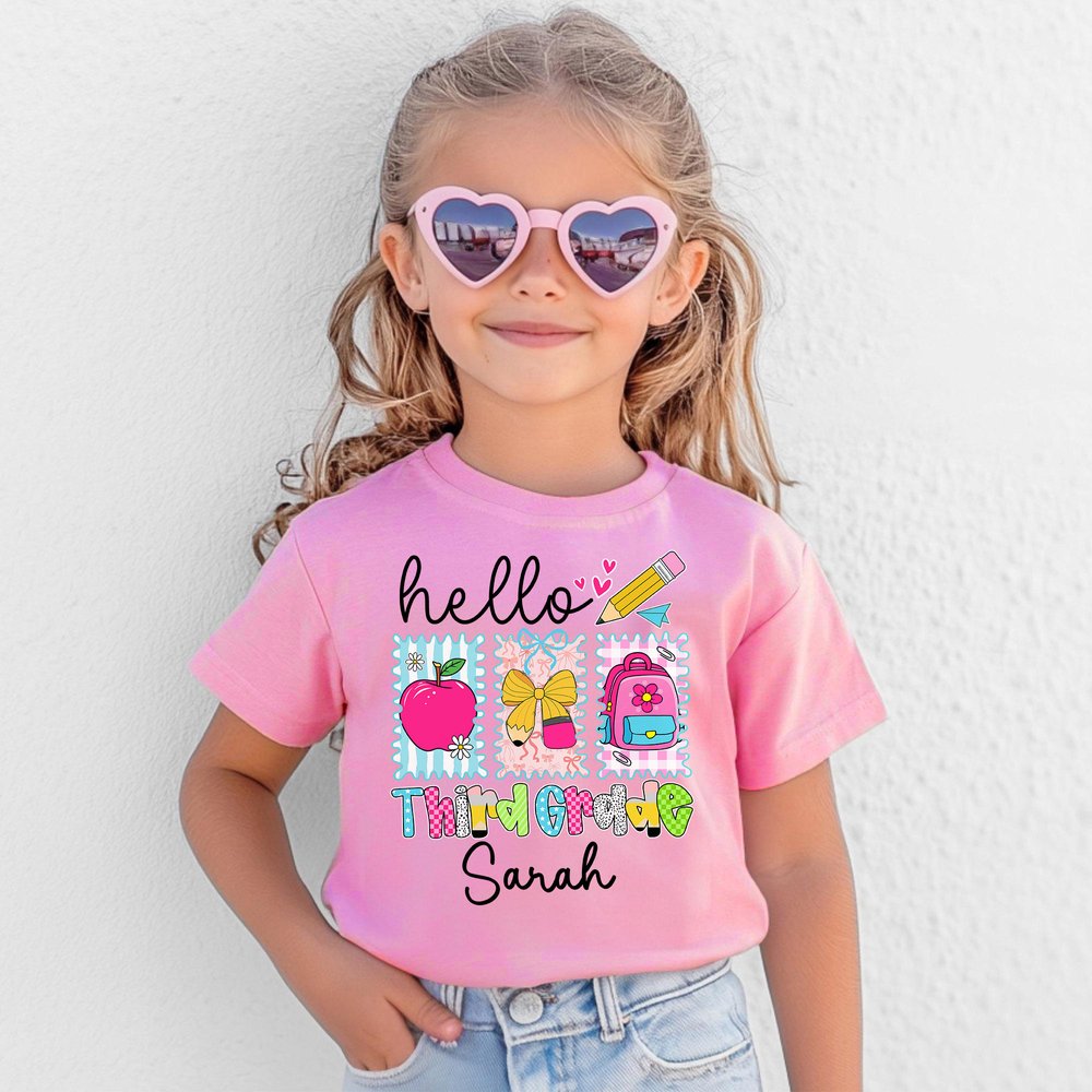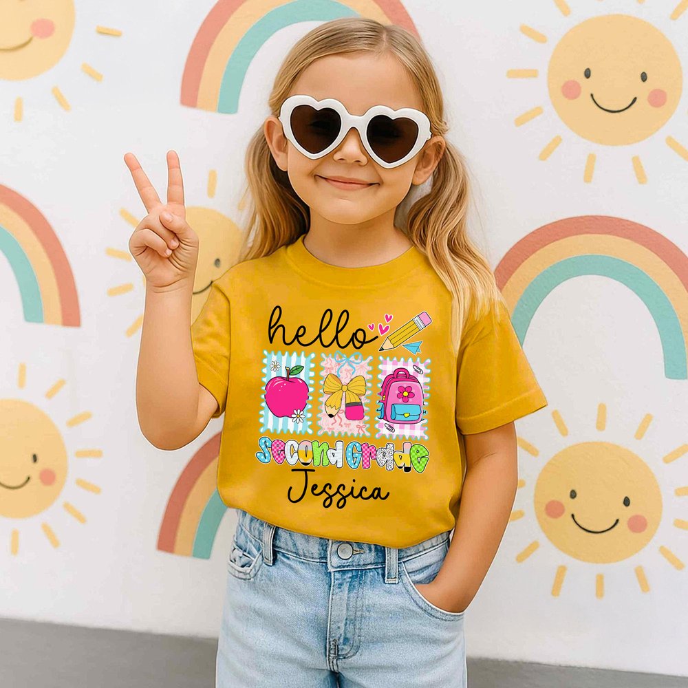 This soft T-shirt is adorned with delightful school-themed illustrations such as apples, pencil bows, and backpacks. You can customize your name and grade on the clothes, celebrating the fun of education with every detail, turning a basic T-shirt into a wearable expression of back-to-school excitement.