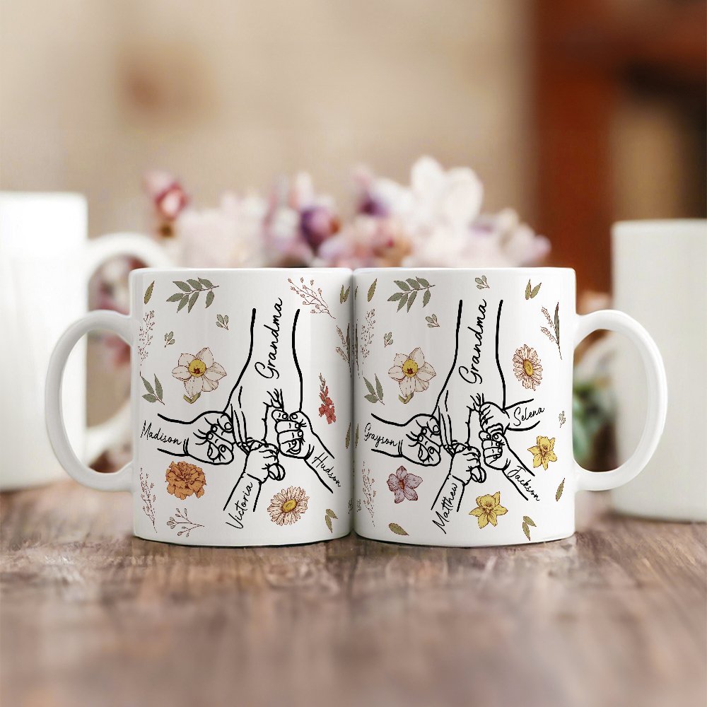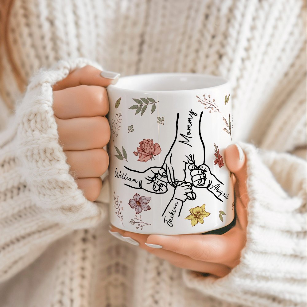 With the image of a small hand holding a larger one it symbolizes the nurturing bond shared in a family. This mug can be personalized with up to 12 names, each represented by a birth flower. Every flower corresponds to a birth month, adding both beauty and symbolic value to the design.