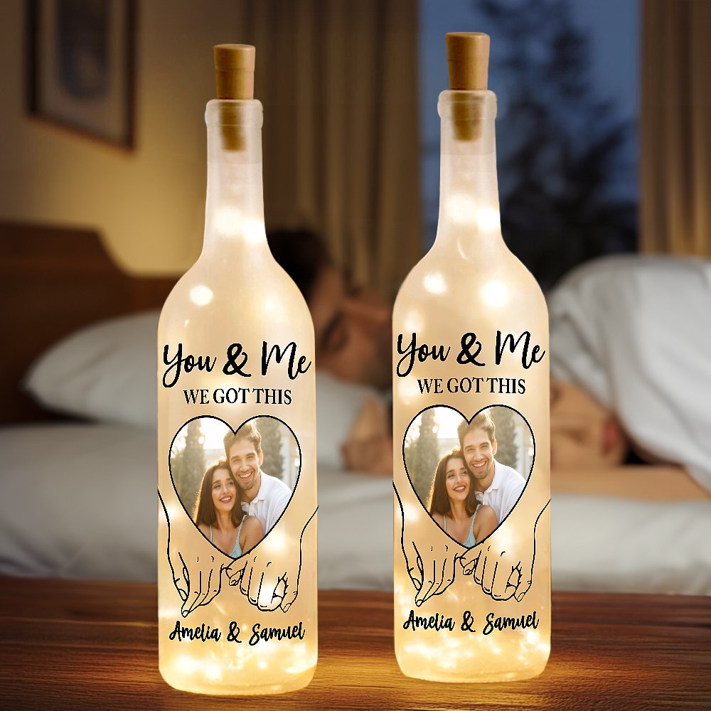 This charming hand-holding pattern bottle lamp can be personalized with your favorite photo, names, and a choice of a romantic quote, making it a truly unique gift. The custom design captures special moments, perfect for couples celebrating love.