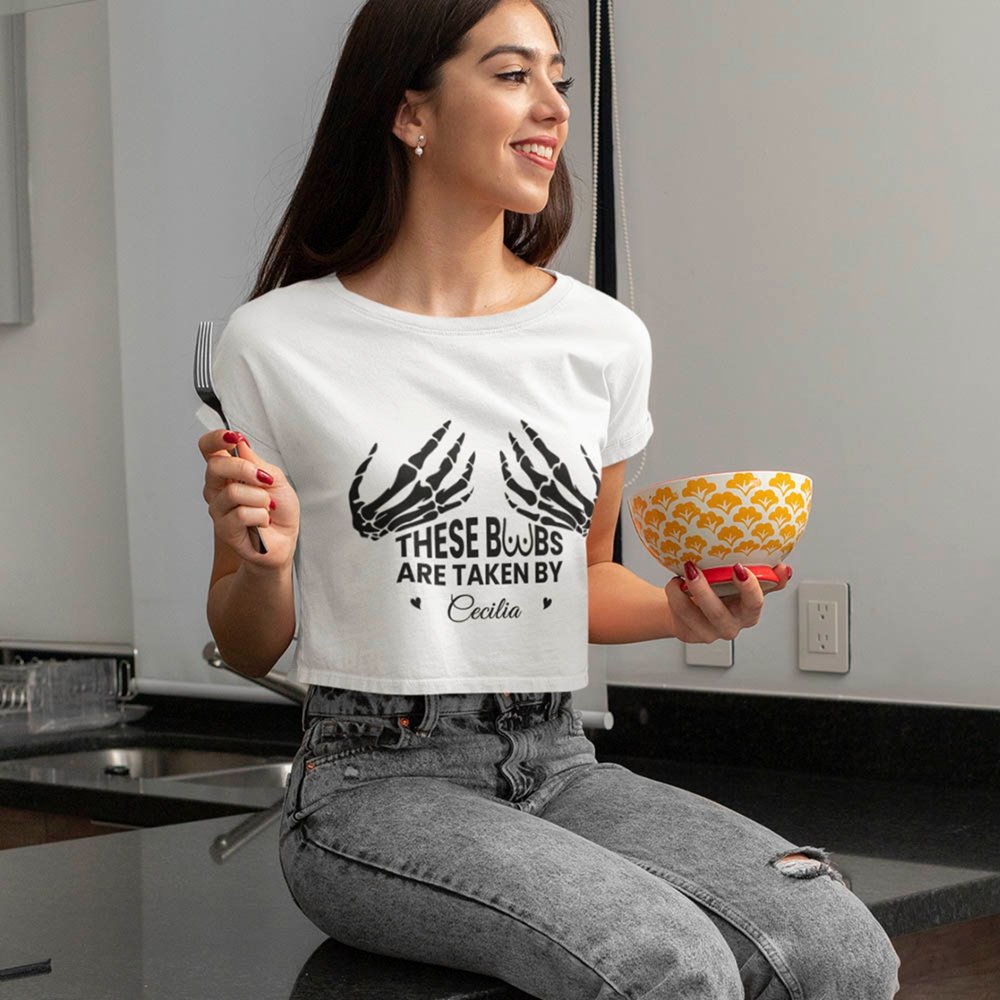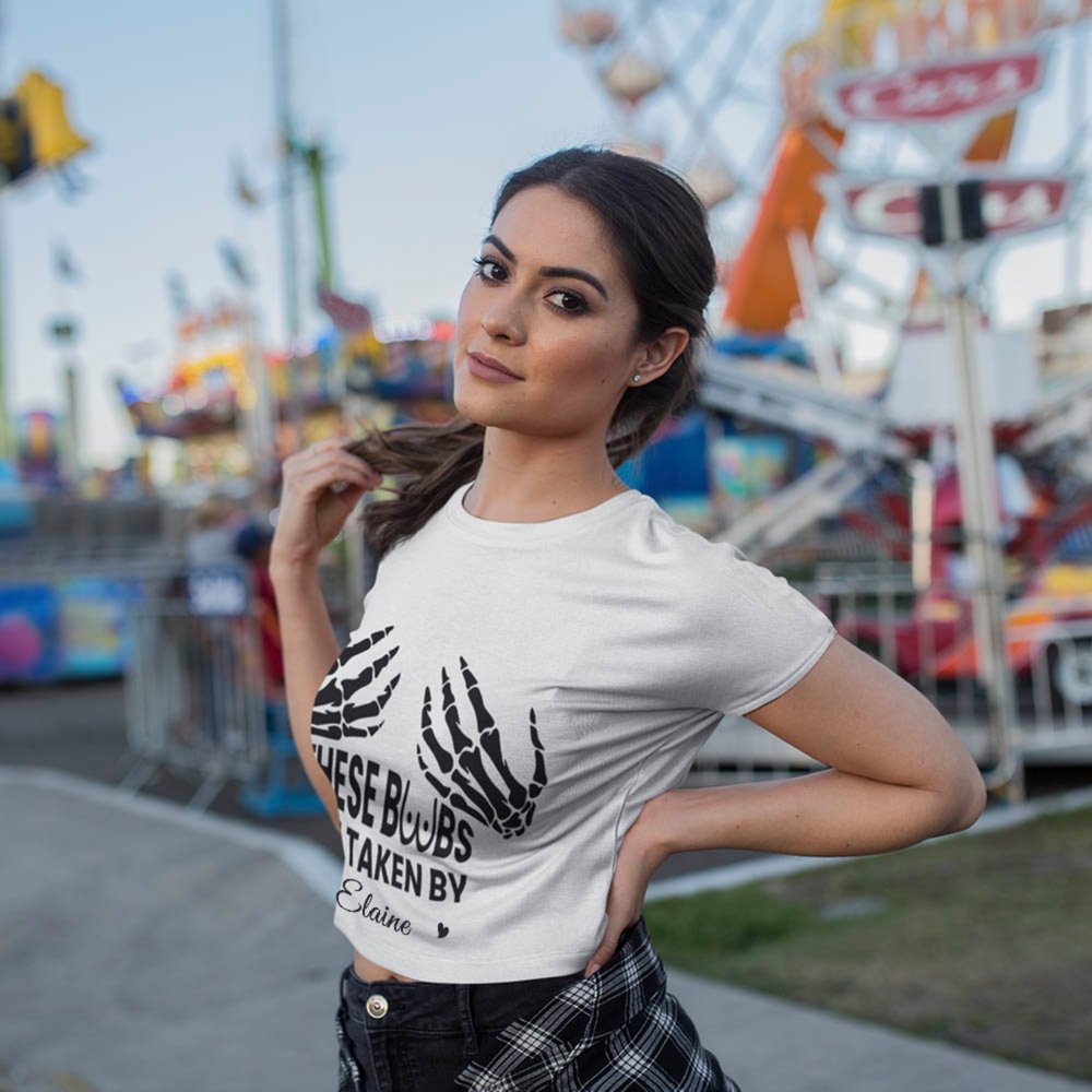 This flirty crop top playfully delivers love and humor, guaranteed to turn heads. Centered with a cheeky skeleton hand design paired with witty text ”These boobs are taken by”, it celebrates the unbreakable bond between you and your partner. Personalize it with a name to transform it into a one-of-a-kind statement piece.