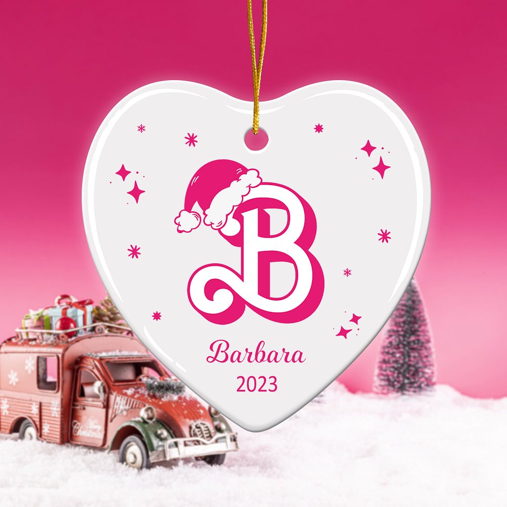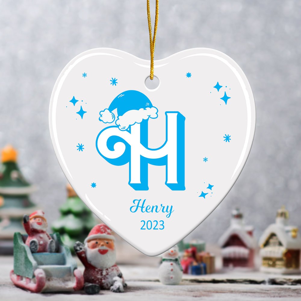 An adorable Santa hat alphabet design is featured in this heart-shaped ceramic ornament. The delightful and whimsical design is sure to bring joy and happiness to anyone who receives it.
