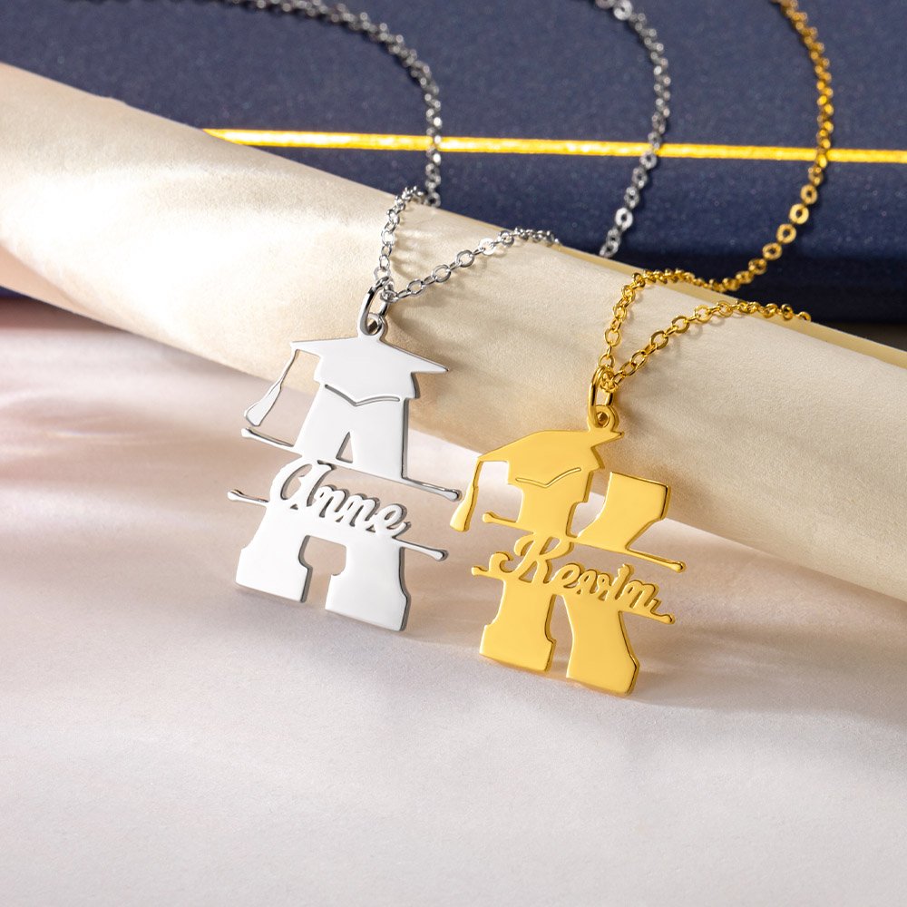 This necklace features a design of a graduation cap adorned with an initial and can be customized with your name. It beautifully combines elegance and personalization, making it a standout piece of jewelry that celebrates your achievement.
