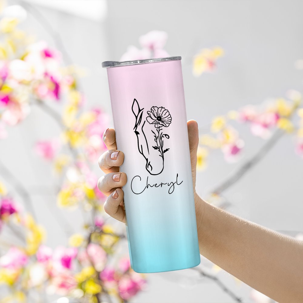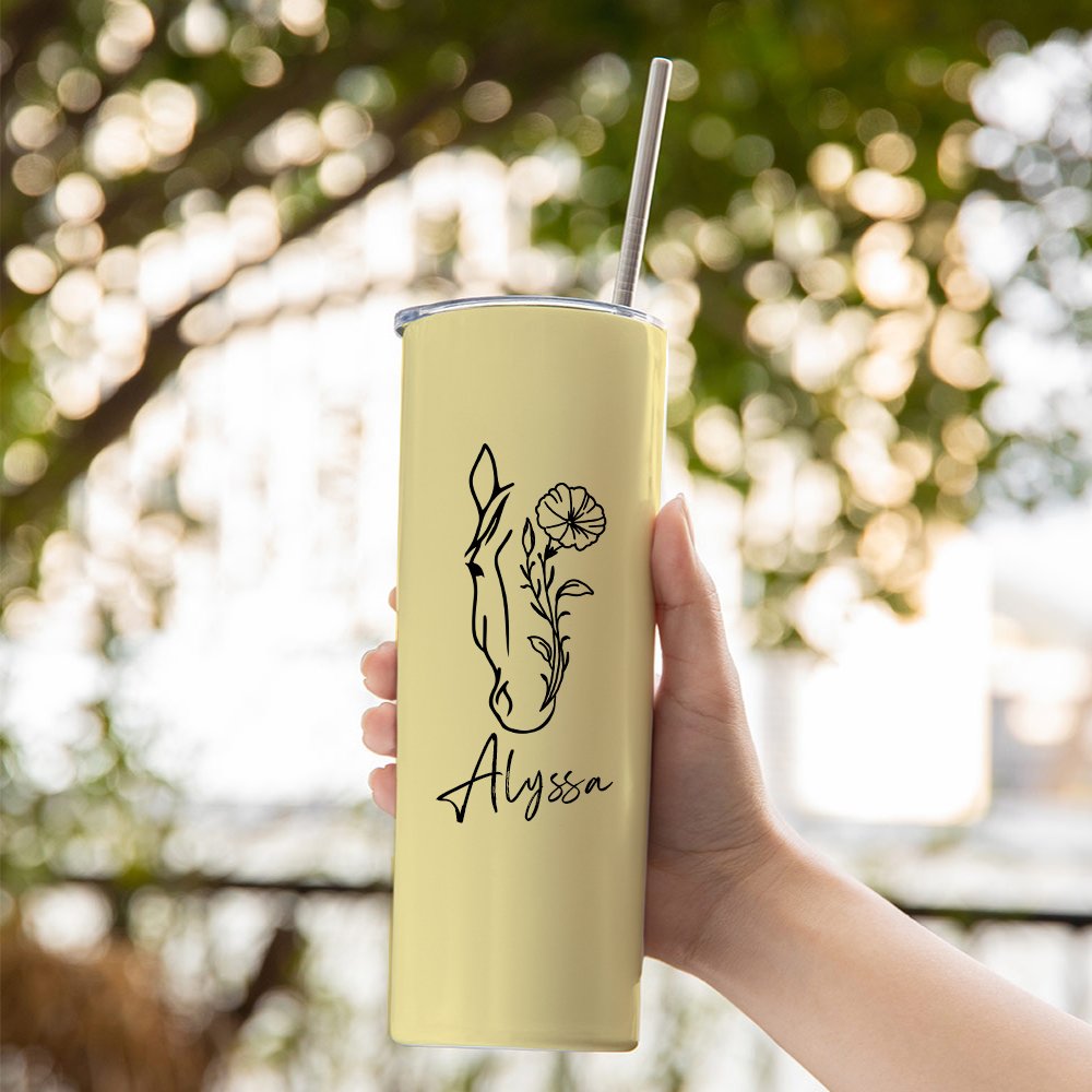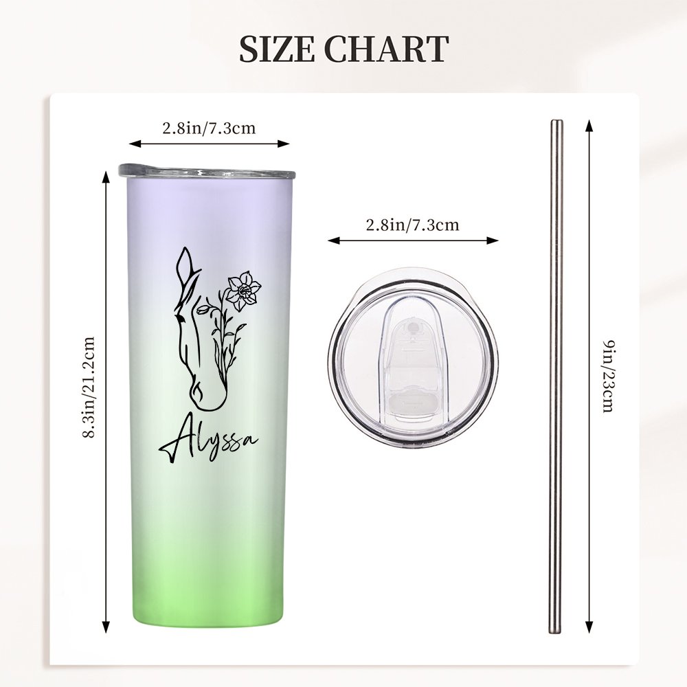 This tumbler features a stunning gradient design that seamlessly blends with a delicate line drawing of a horse intertwined with your birth flower. The personalized touch of your name adds a unique and special flair to this exquisite tumbler, making it a standout accessory for horse lovers.