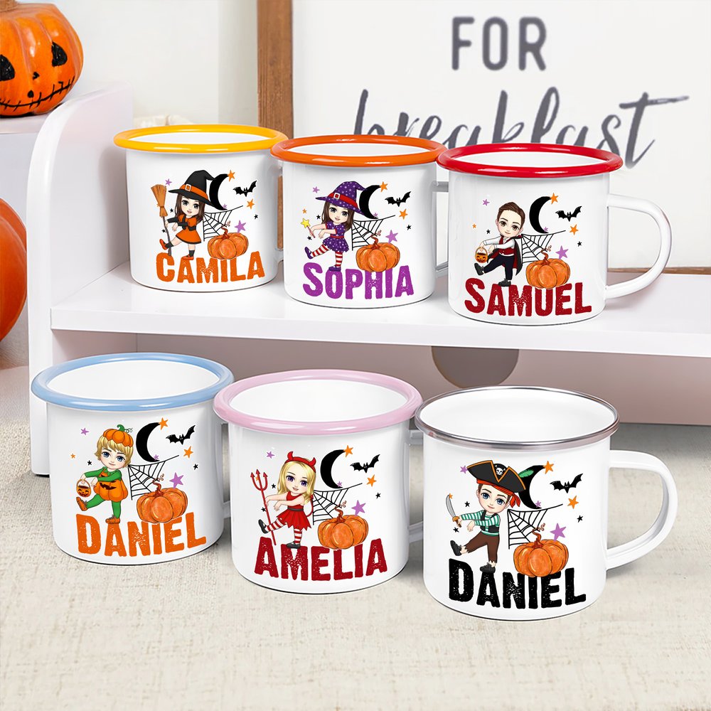 The cup showcases lively Halloween cartoon characters, surrounded by charming pumpkins, bats, spider webs, brooms, and stars. You can customize it with your child's cartoon likeness and name, perfectly blending the fun of the holiday with personalized elements, making this enamel mug a special holiday keepsake.