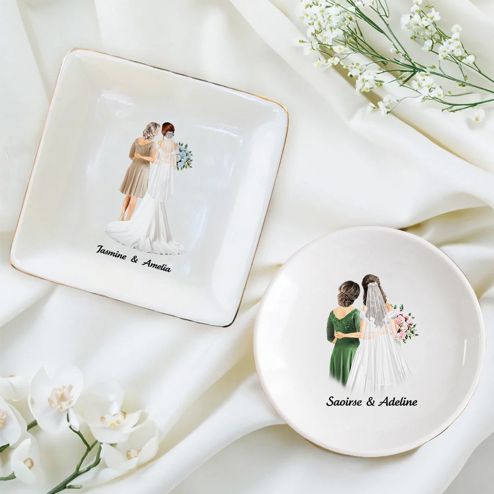 Choose from three shapes: round, square, and heart-shaped. The front can customize the images of the bride and mother as you like. You can also add names and pick background colors. Integrate exclusive mother-daughter memories into the design, creating a unique wedding jewelry dish.