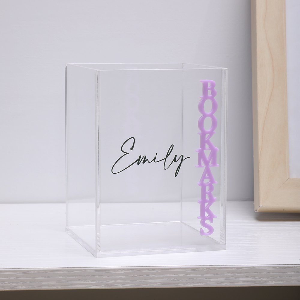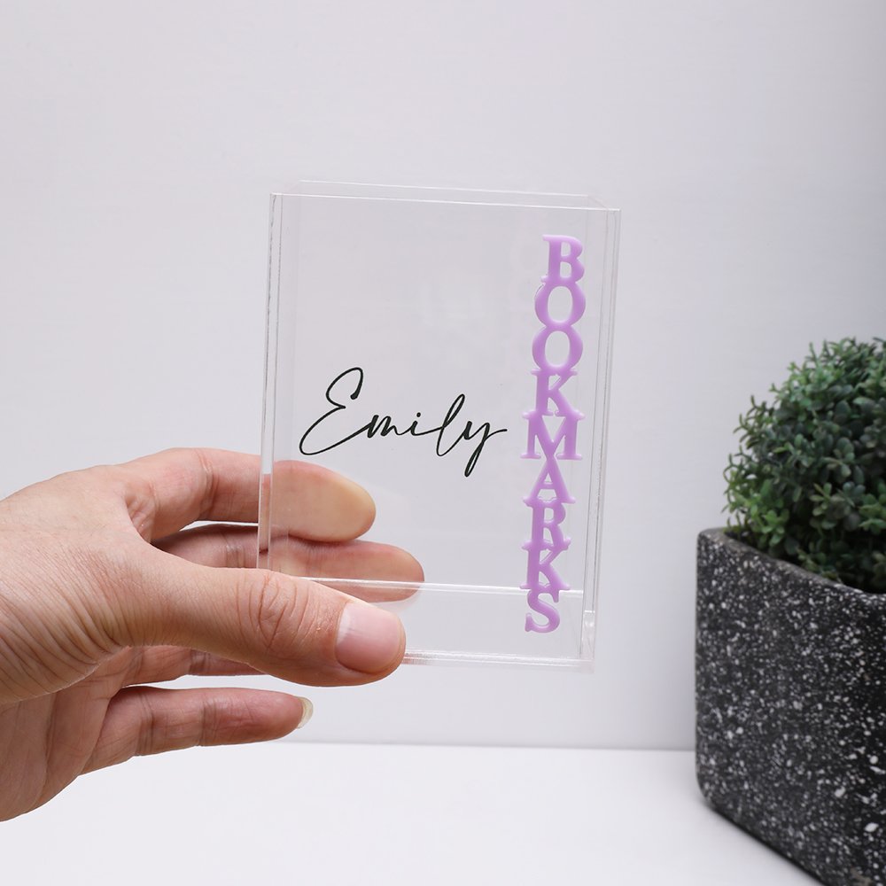 This bookmark holder is simple yet stylish. It is made of transparent material, which can display the bookmarks placed inside, adding a sense of transparency and agility. The holder is printed with the eye-catching words "BOOKMARKS" and a personalized name. It is both practical and uniquely decorative and perfectly integrates into any reading space.