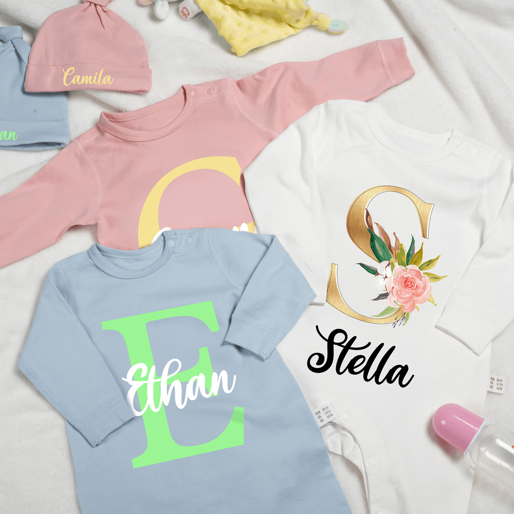 This baby outfit set features two distinct design inspirations: one highlights a minimalist, solid-color initial pattern that is vibrant and eye-catching. At the same time, the other beautifully combines charming floral elements with initials to create rich visual layers. Each item can be customized with the baby’s name, adding a unique personal touch that is both heartwarming and delightful. This stylish ensemble allows your little one to stand out on every occasion, radiating charm and character.