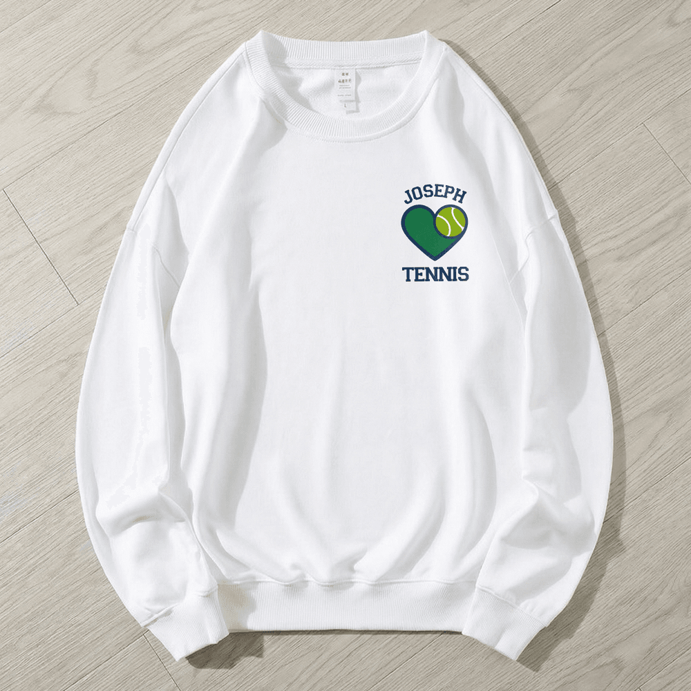 Dette spesialtilpassede plagget har et livlig design med en tennisball inne i et hjerte, sammen med teksten "TENNIS" og plass til et personlig navn. Du kan velge mellom en rekke farger som passer til din stil, og forvandle en enkel t-skjorte til et unikt plagg som feirer din kjærlighet til tennis og viser frem din unike identitet.
