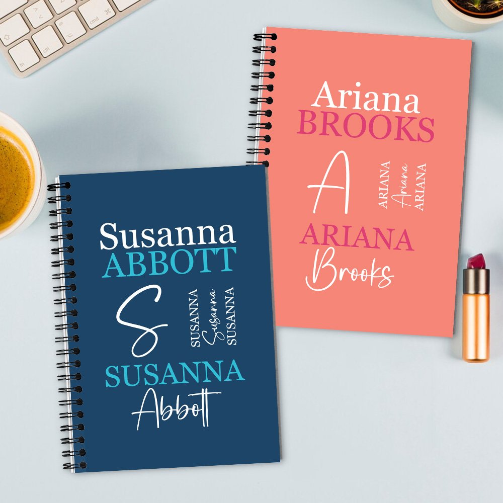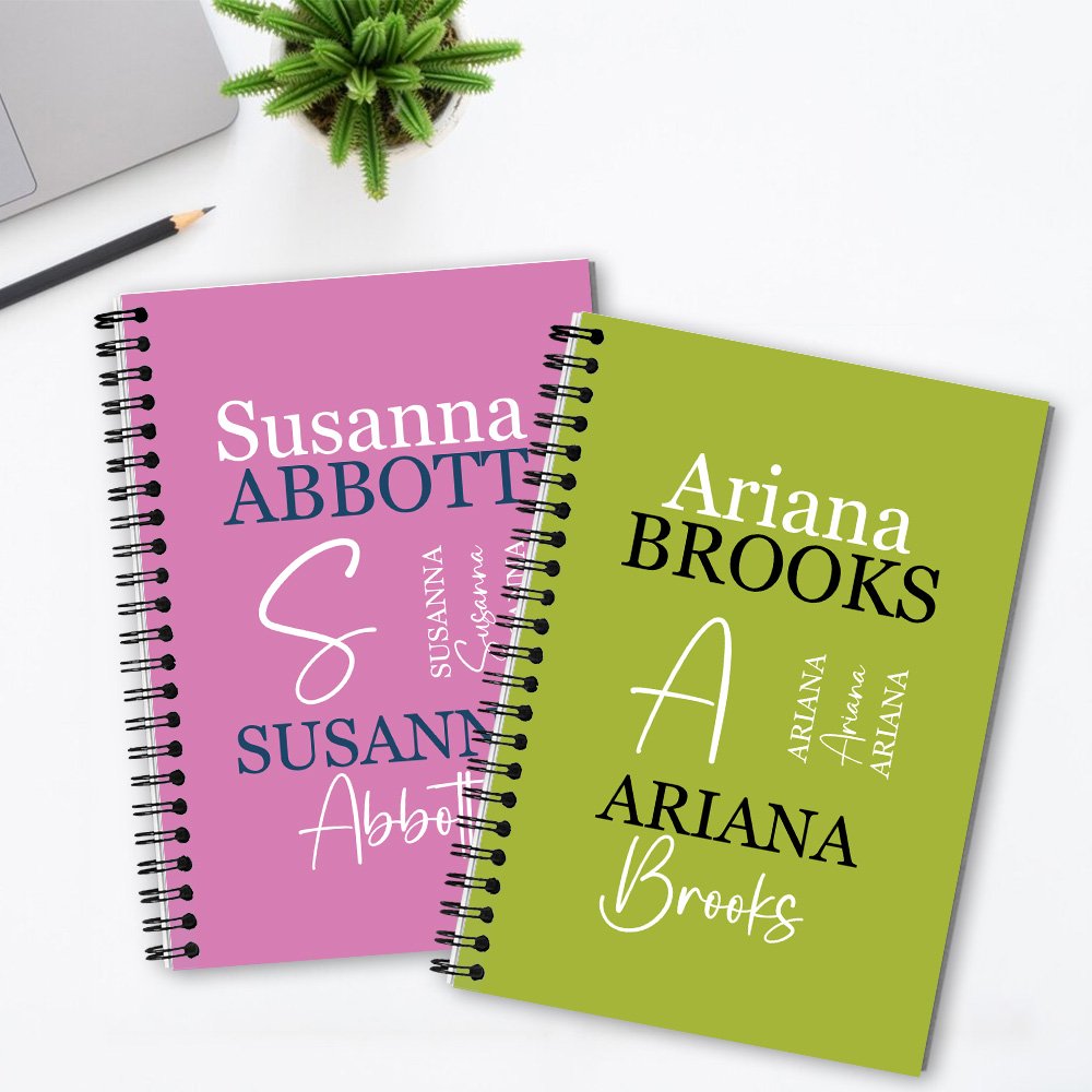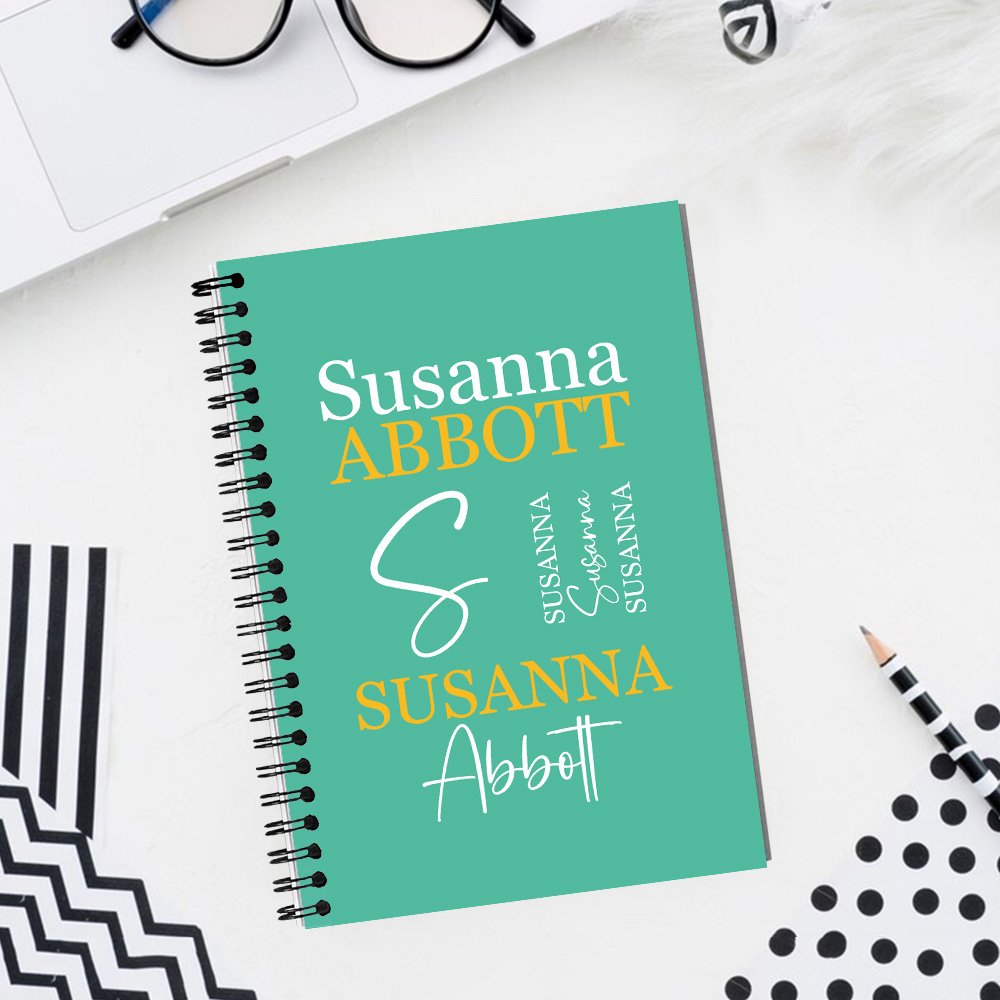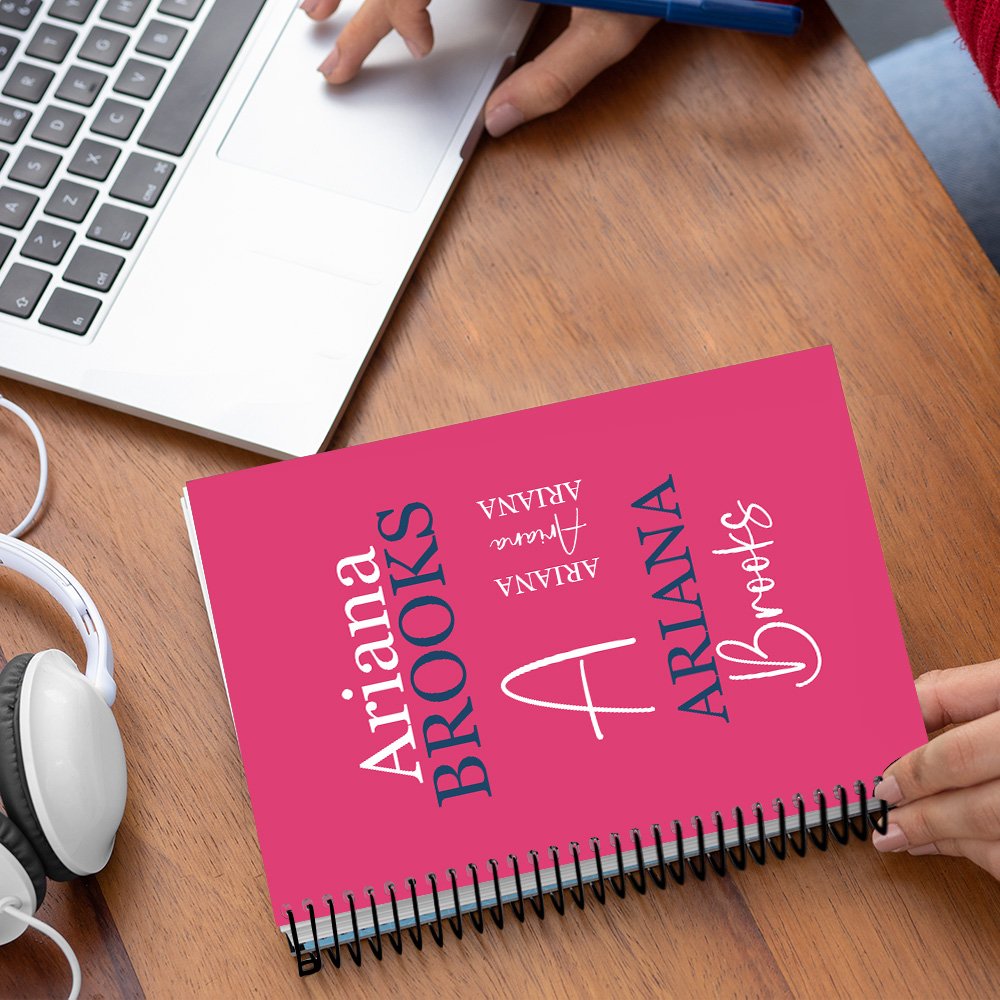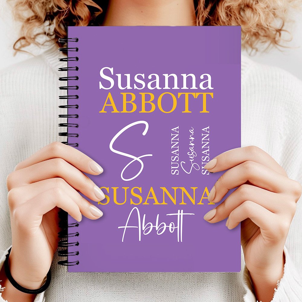 Denne notatboken har et ordsky-design. Du kan personalisere eierens fornavn og etternavn på omslaget for å gi et personlig preg som forsterker følelsen av mestring og egenomsorg.