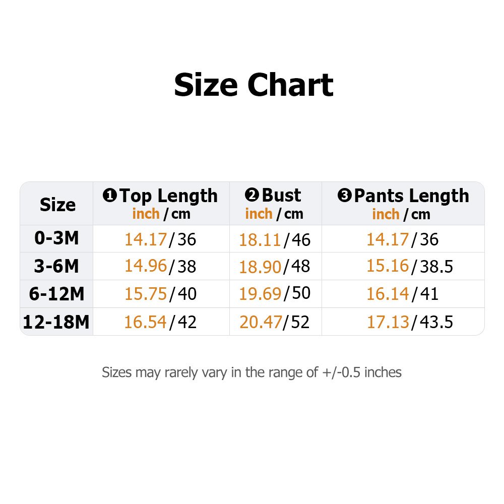 | Measurement: | Bodysuit & Pant - 0-3M, 3-6M, 6-12M, 12-18M Swaddle Hat - 13'' × 6.5''(33cm × 16.5cm) |