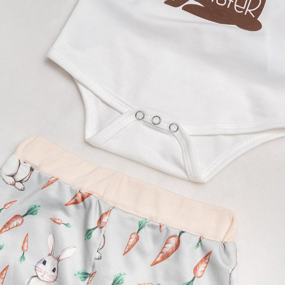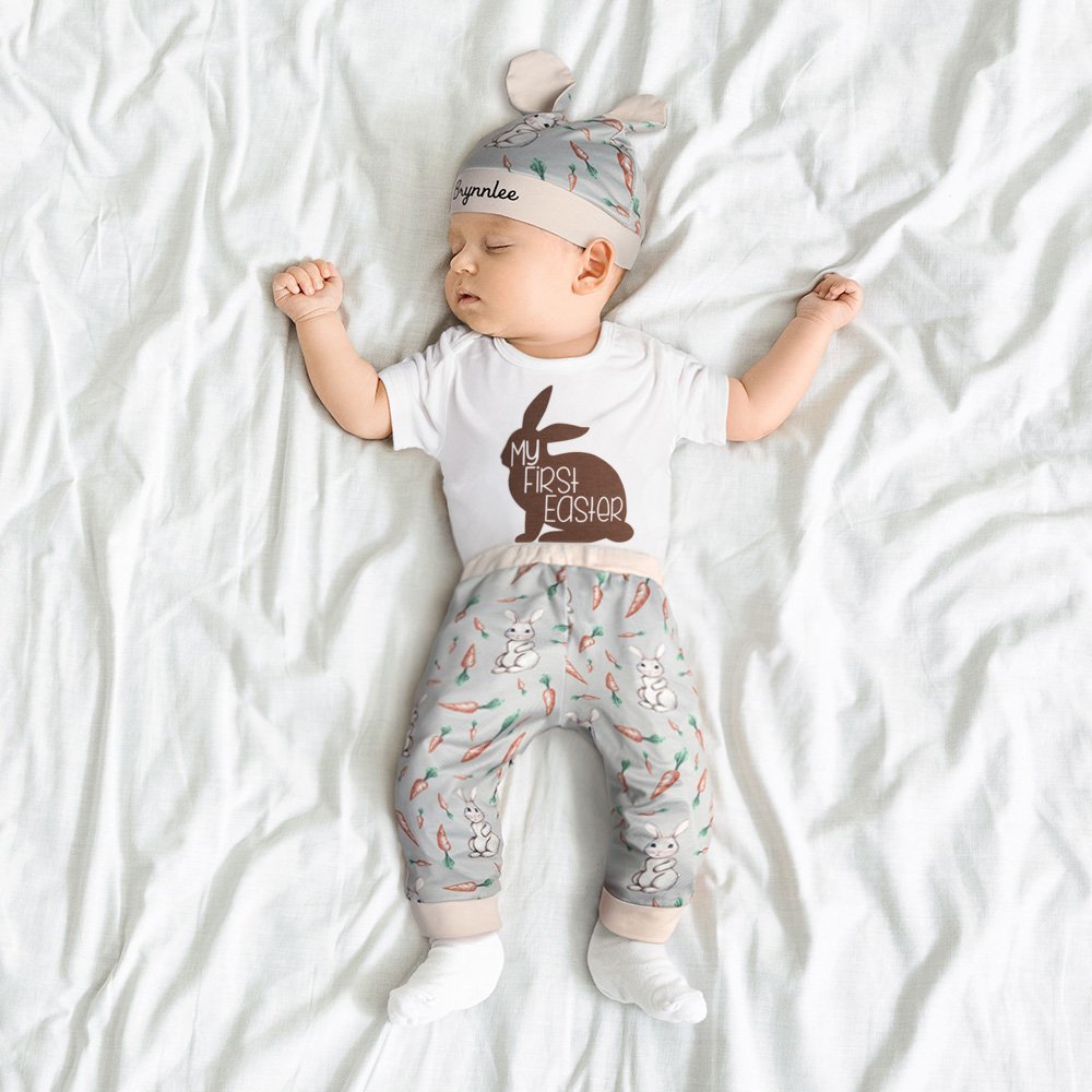 This bodysuit set features a cute Easter theme, with a bunny silhouette and a "My First Easter" slogan, and the pants and bunny ear hat feature a rich pattern of bunnies and carrots, which is cheerful and festive. You can also personalize the hat with your name to create a unique holiday look for your child.