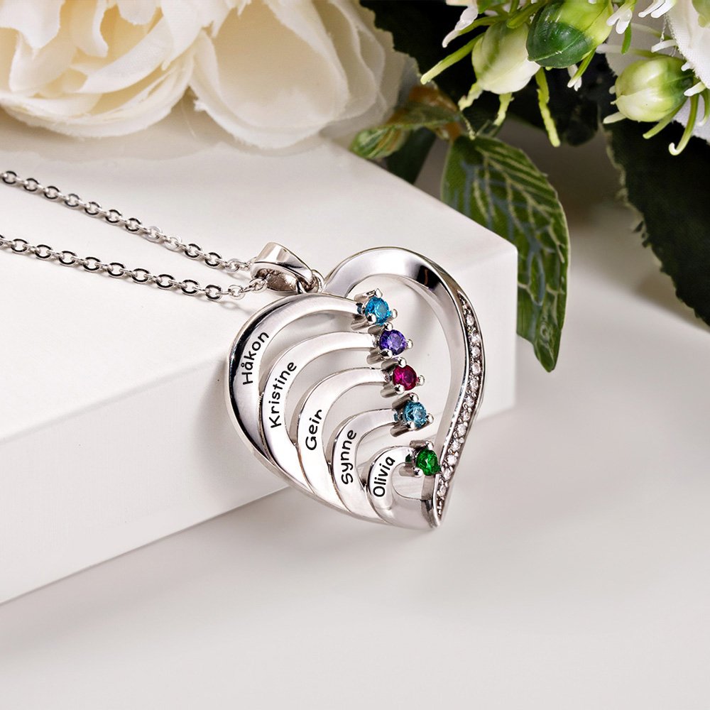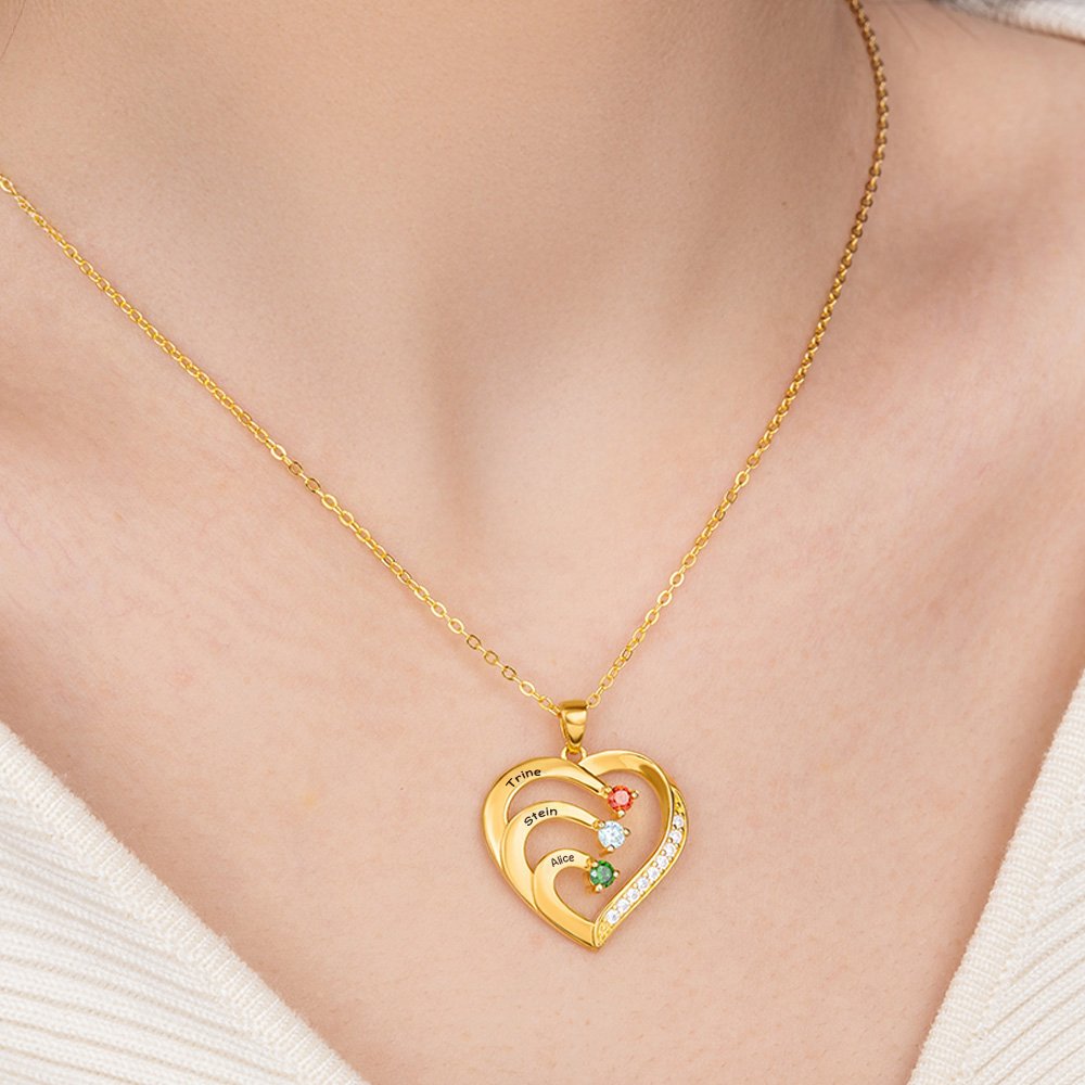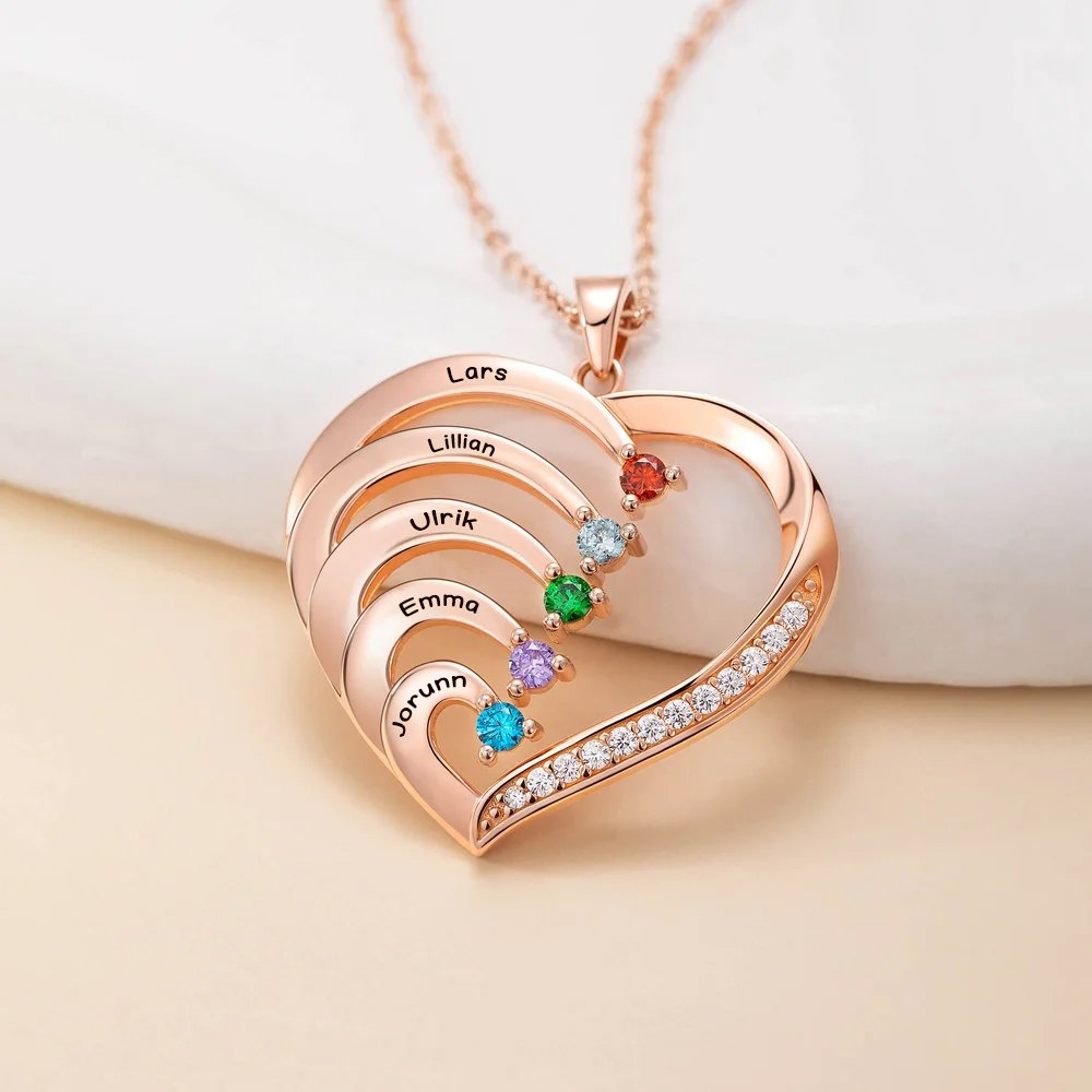 Dette halskjedet har en klassisk hjerteform som symboliserer kjærlighet og tilknytning. Det større hjertet omfavner flere mindre hjerter, hver dekorert med en fødselsstein som representerer dine kjære. Designet gjør det mulig å tilpasse med 1–6 fødselssteiner og tilhørende navn. Hver ekstra stein symboliserer et nytt lag av kjærlighet og gjør smykket til en vakker hyllest til familien.