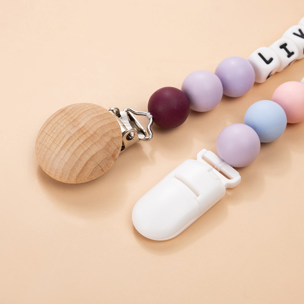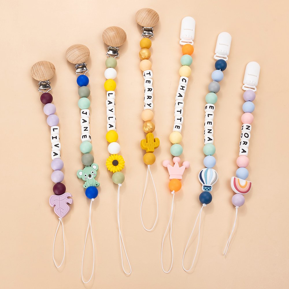 This pacifier clip features a beaded chain design, designed in a natural country style with cute animal shapes, including crowns, rainbows, daisies, koalas, and more, adding a whimsical touch to your baby's essentials. You can personalize it with your child's name, making it a truly special item that reflects your child's personality.