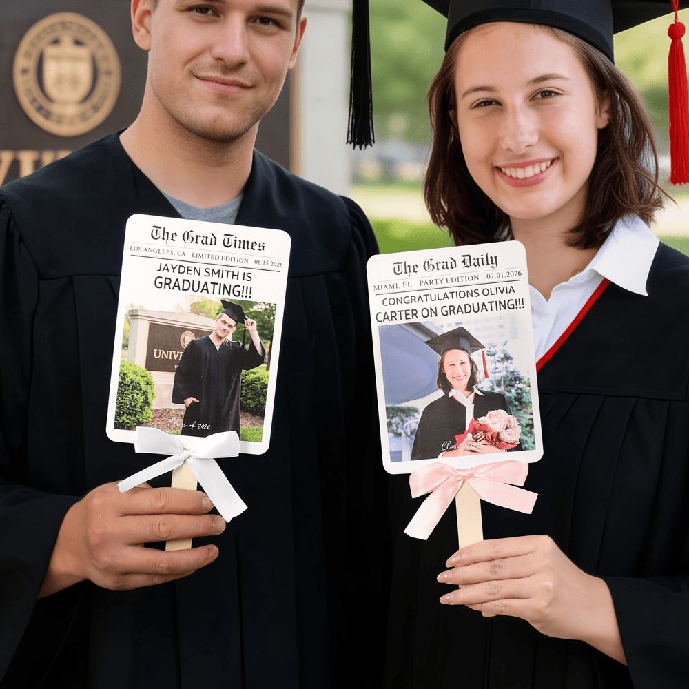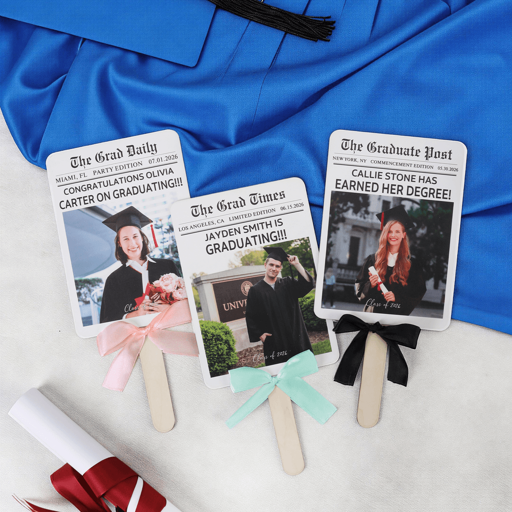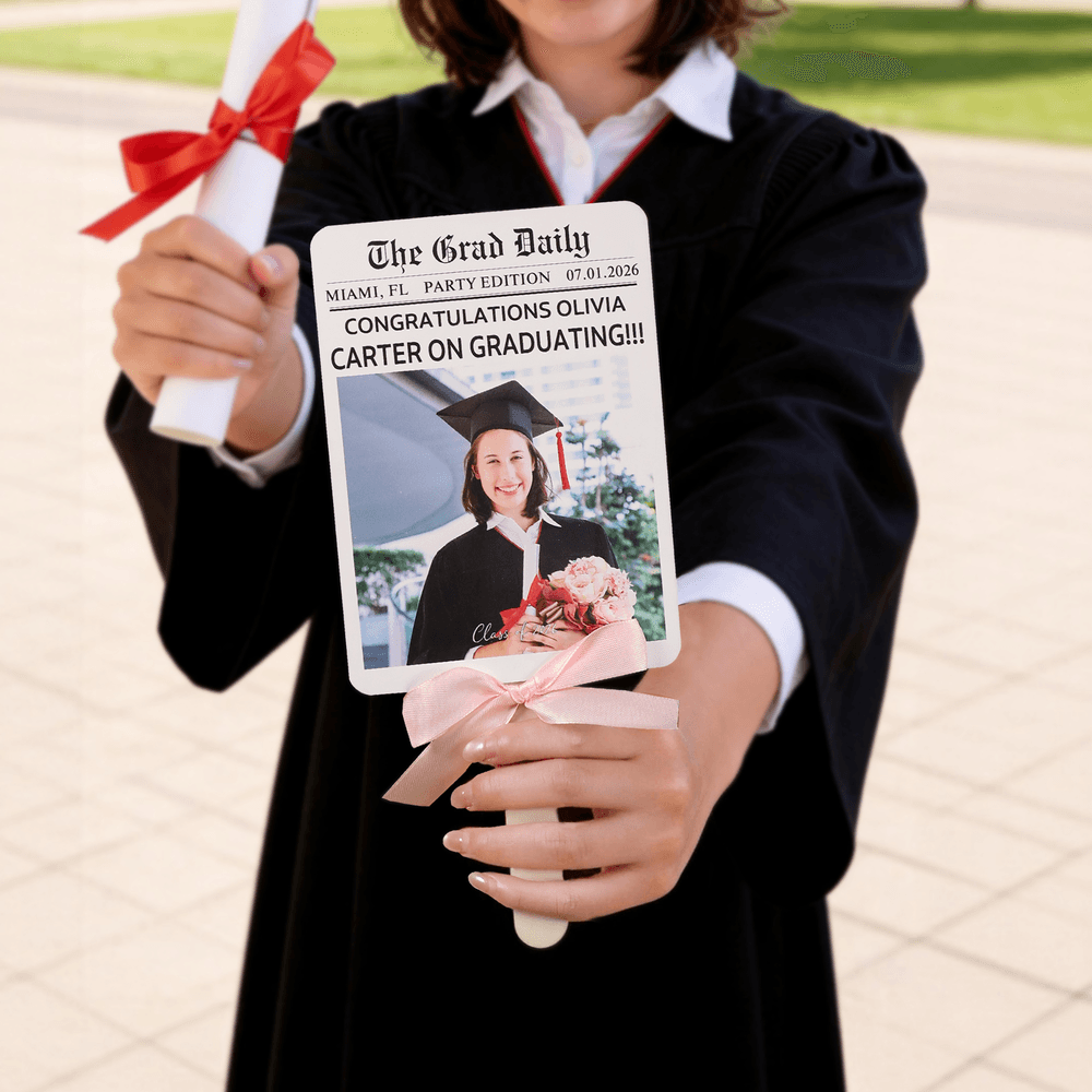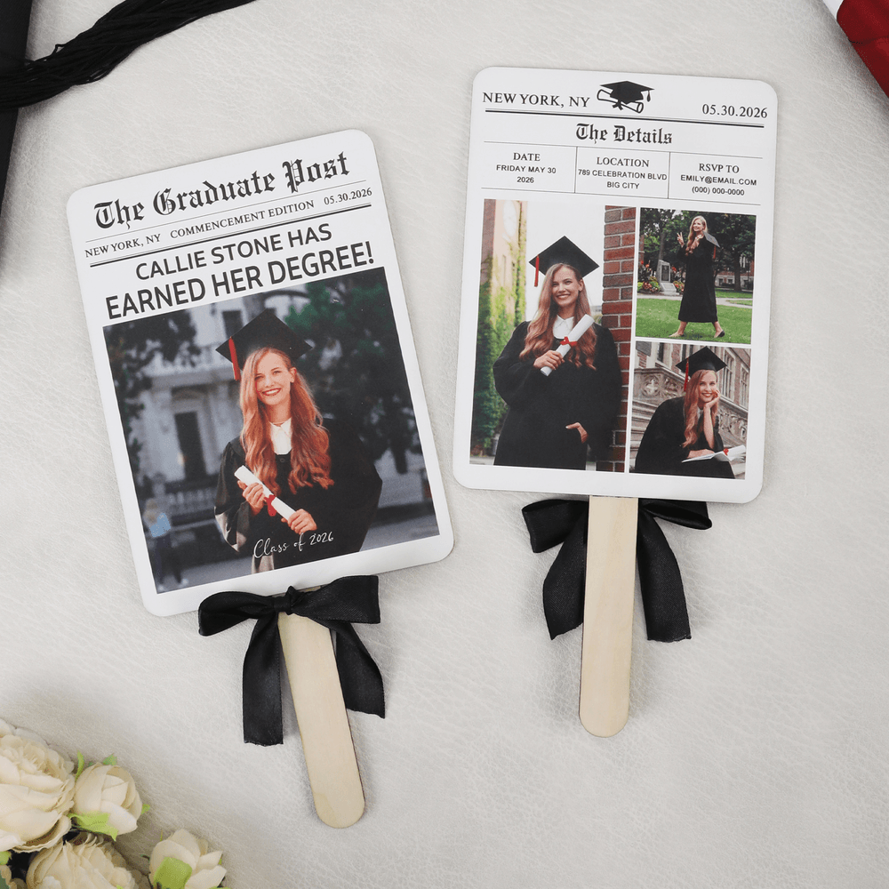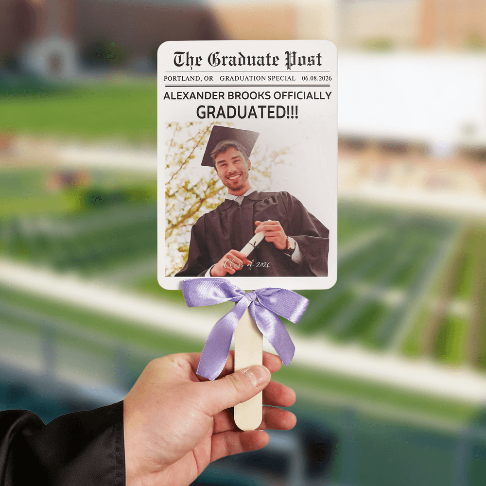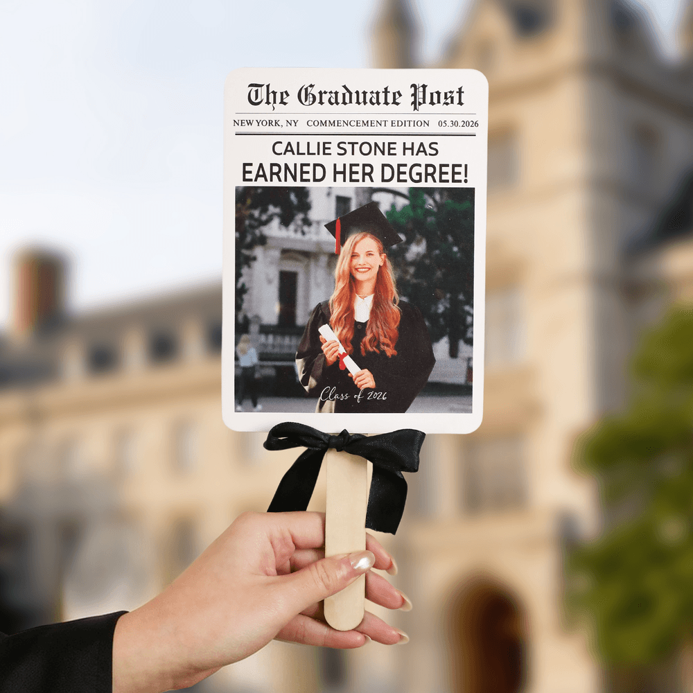 Denne viften er inspirert av gamle avisforsider, og presenterer eksamensbildet, årstallet og feiringsteksten din i et retrooppsett. En fin sløyfe og et håndtak i tre gir sjarm og gjør den til et fint minne. Fås med enkeltsidig eller dobbeltsidig utskrift, med tekst som kan tilpasses - slik at det stolte eksamensøyeblikket blir til din helt egen "overskriftsnyhet" og gjør seremonien i eksamenssesongen til noe helt spesielt.