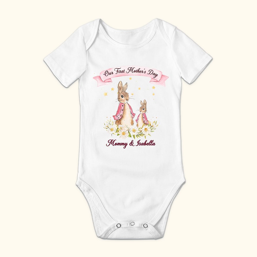 Our garments are designed with a cute parent-child peter rabbit as the design element, the baby rabbit and the mother play together in the flowers, and the picture is beautifully warm and cozy, as a way to express the love between mother and child, and with the celebratory text of "Our First Mother's Day", which makes the festive atmosphere more strong and warm. We offer the option of adding your and your child's name to the front of the garment, this customization adds a personalized touch and makes the garment more meaningful.