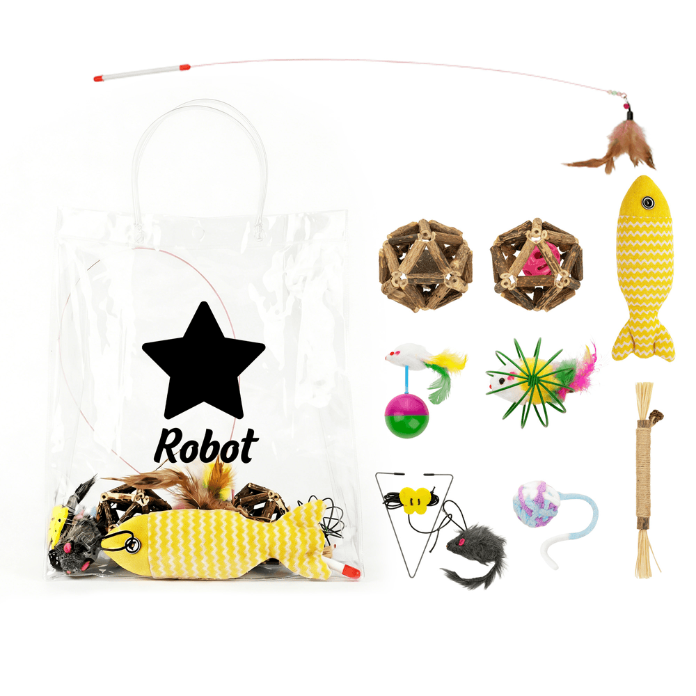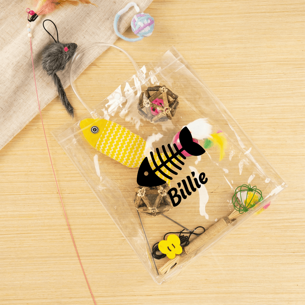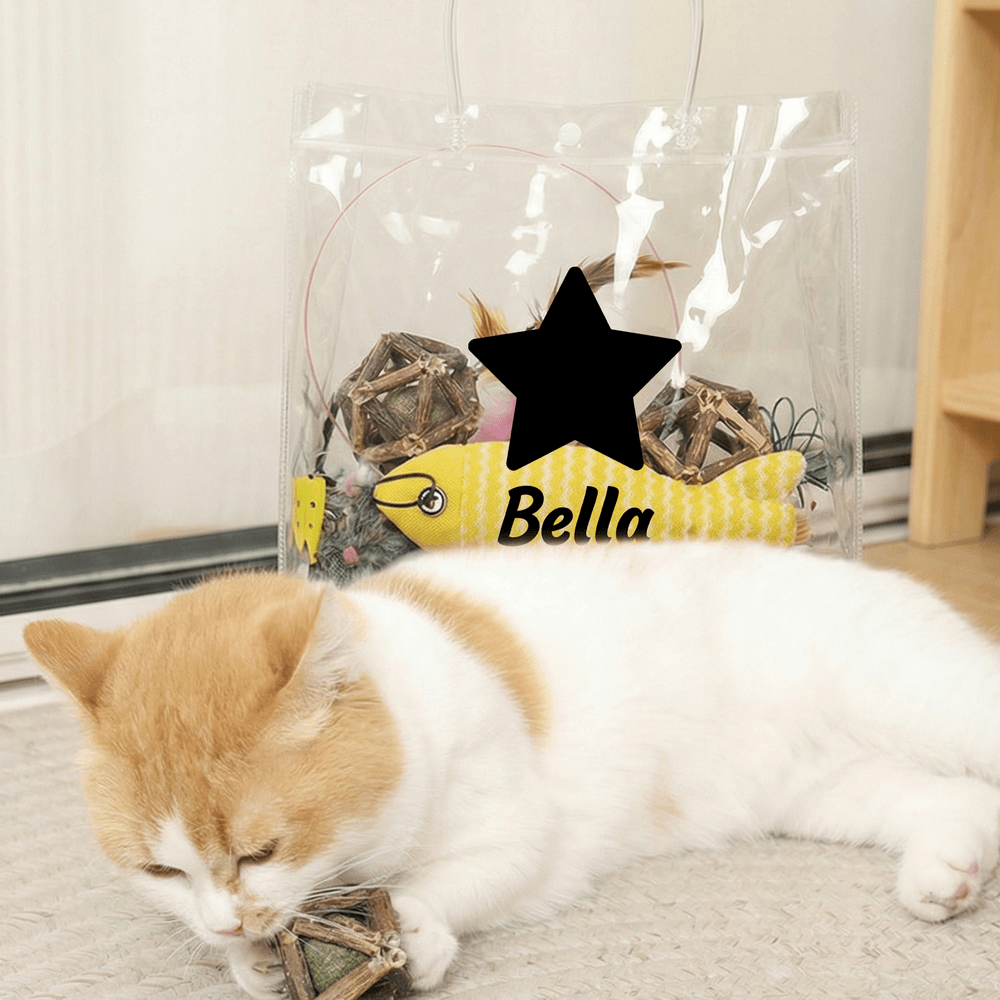 This delightful cat toy set features a variety of engaging items, all presented in a transparent bag adorned with names, hearts, paw prints, stars, or fish bones. Each toy is thoughtfully designed to captivate your cat’s attention, making playtime joyful and interactive.