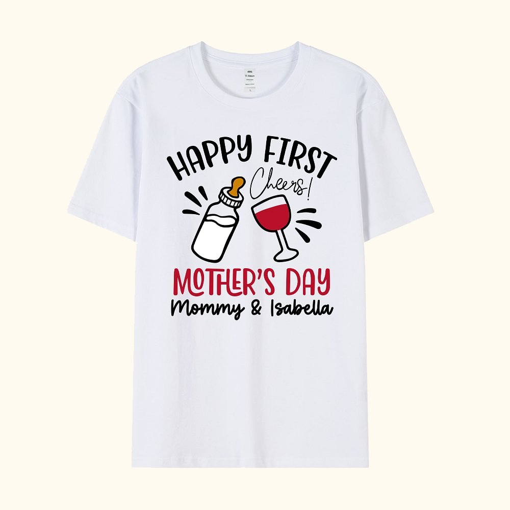 This happy first Mother's Day T-shirt is a fun and fashionable way to celebrate a new mom's first Mother's Day. Featuring an adorable design that combines baby bottle and wine glass patterns, it captures the joy and love between mom and baby.