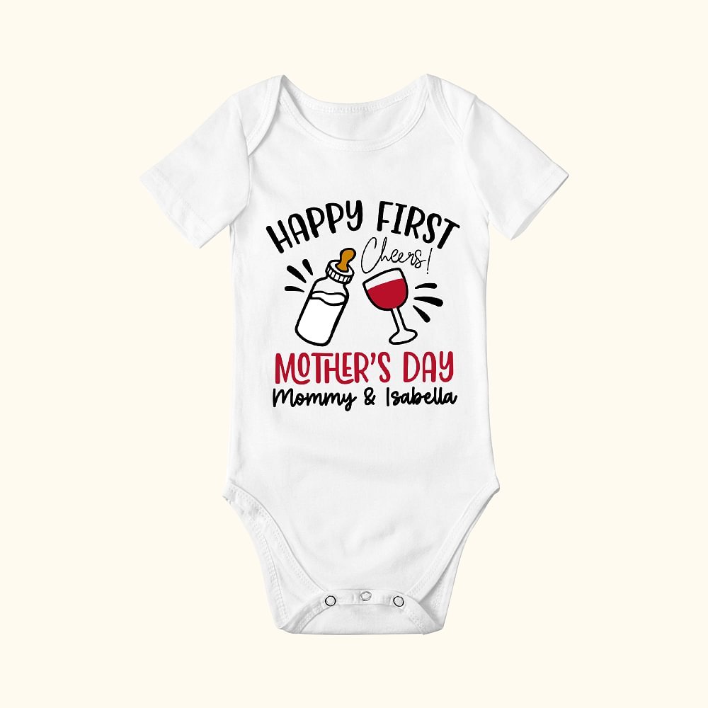 Our happy first Mother's Day baby onesie is an adorable and customized gift for new moms. Featuring a playful combination of baby bottles and wine glasses, this design captures the joy and love between mother and baby. Add meaningful personal text creating a unique gift to their first Mother's Day.