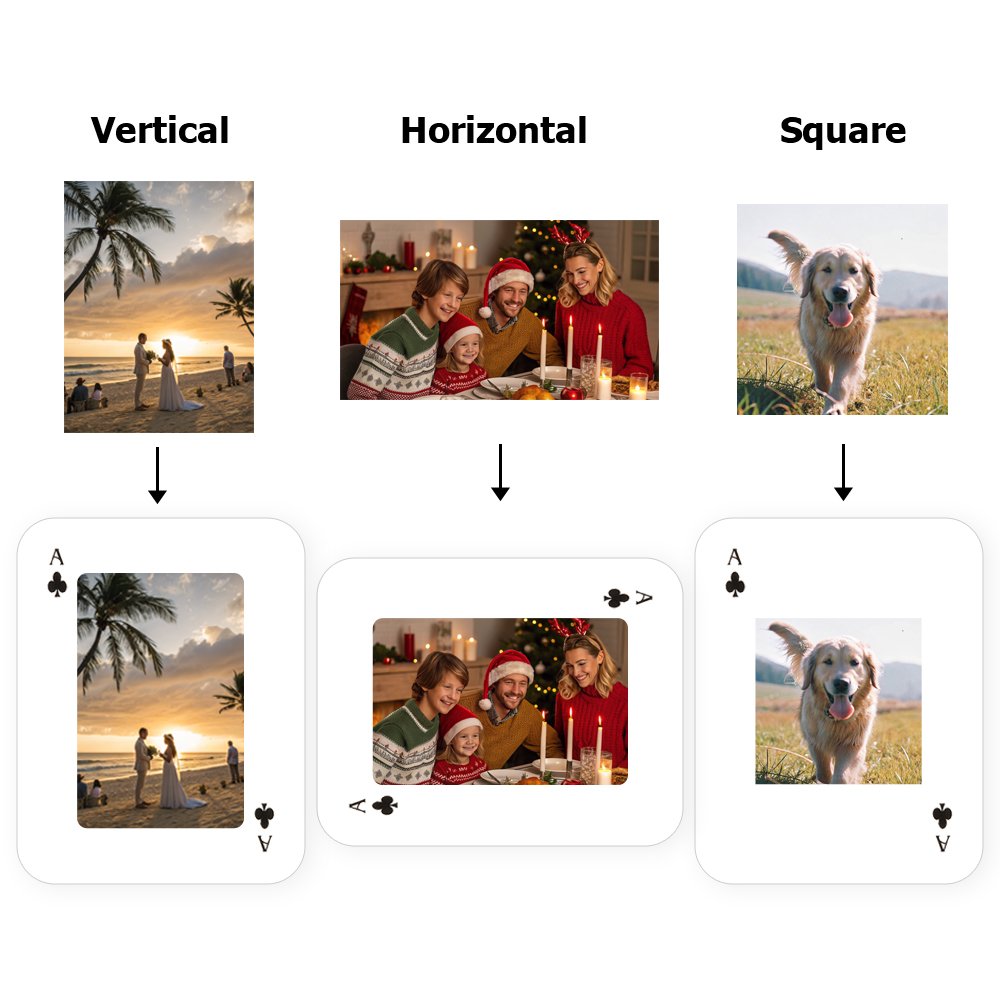 Print quality is related to the photo resolution provided. Please provide a high-resolution photo. The length and width of the image printed on the playing cards will correspond to the height and width of the print frame. Please try to upload a photo of the appropriate size. Depending on the size of the image provided, it may be cropped appropriately.