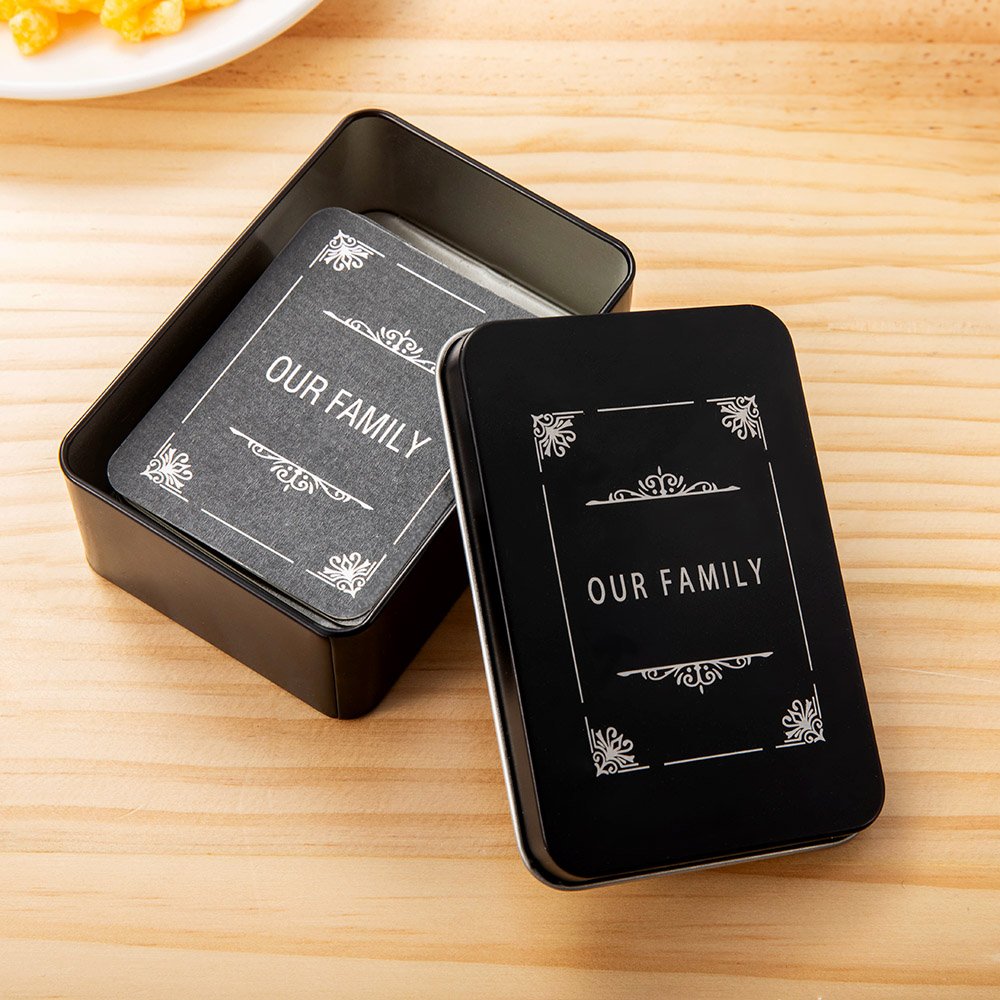 Create a personalized deck of cards adorned with your favorite photos and messages, transforming each card into a cherished keepsake. The deck comes with a customizable black metal tin, allowing you to add your text. This durable tin protects your cards and serves as an elegant display piece, beautifully complementing your personalized playing cards.