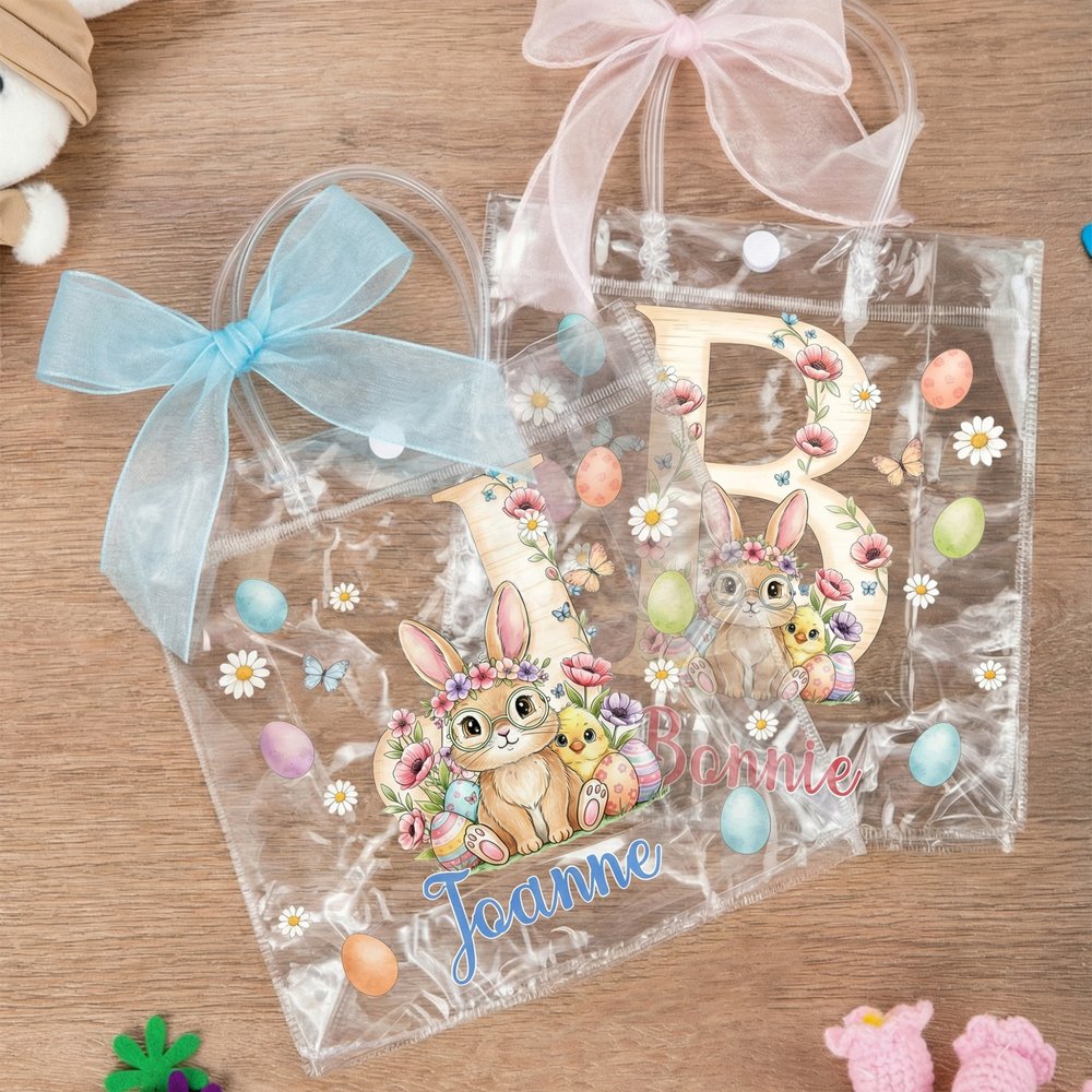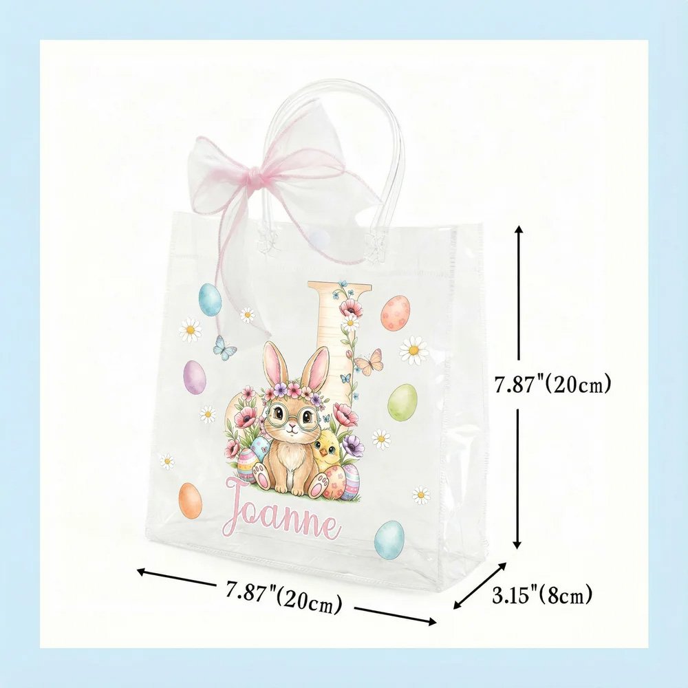 Denne gjennomsiktige gavevesken har en sjarmerende rosa sløyfe og lekne påskemotiver, inkludert søte kaniner, kyllinger og fargerike egg. Du kan personliggjøre den med navn eller initialer, slik at du får en spesiell og festlig veske skreddersydd for den lille.