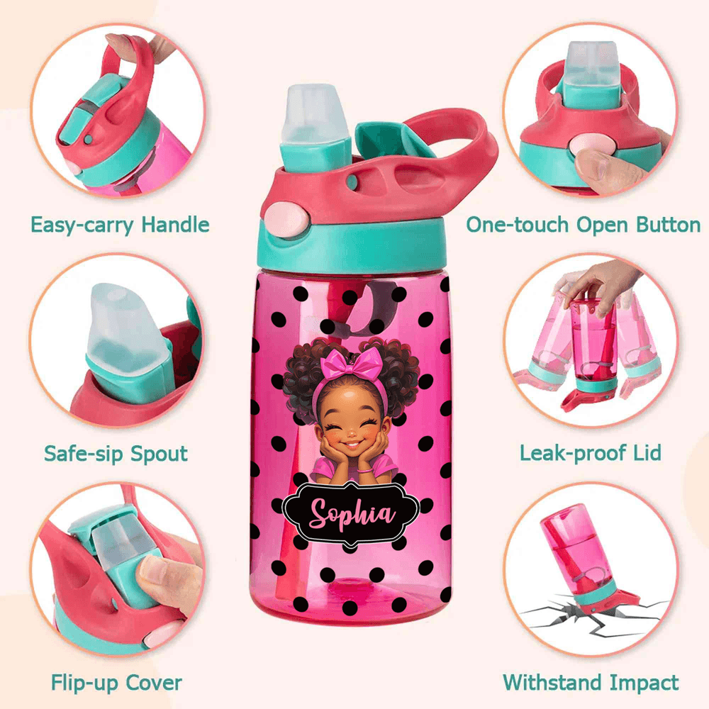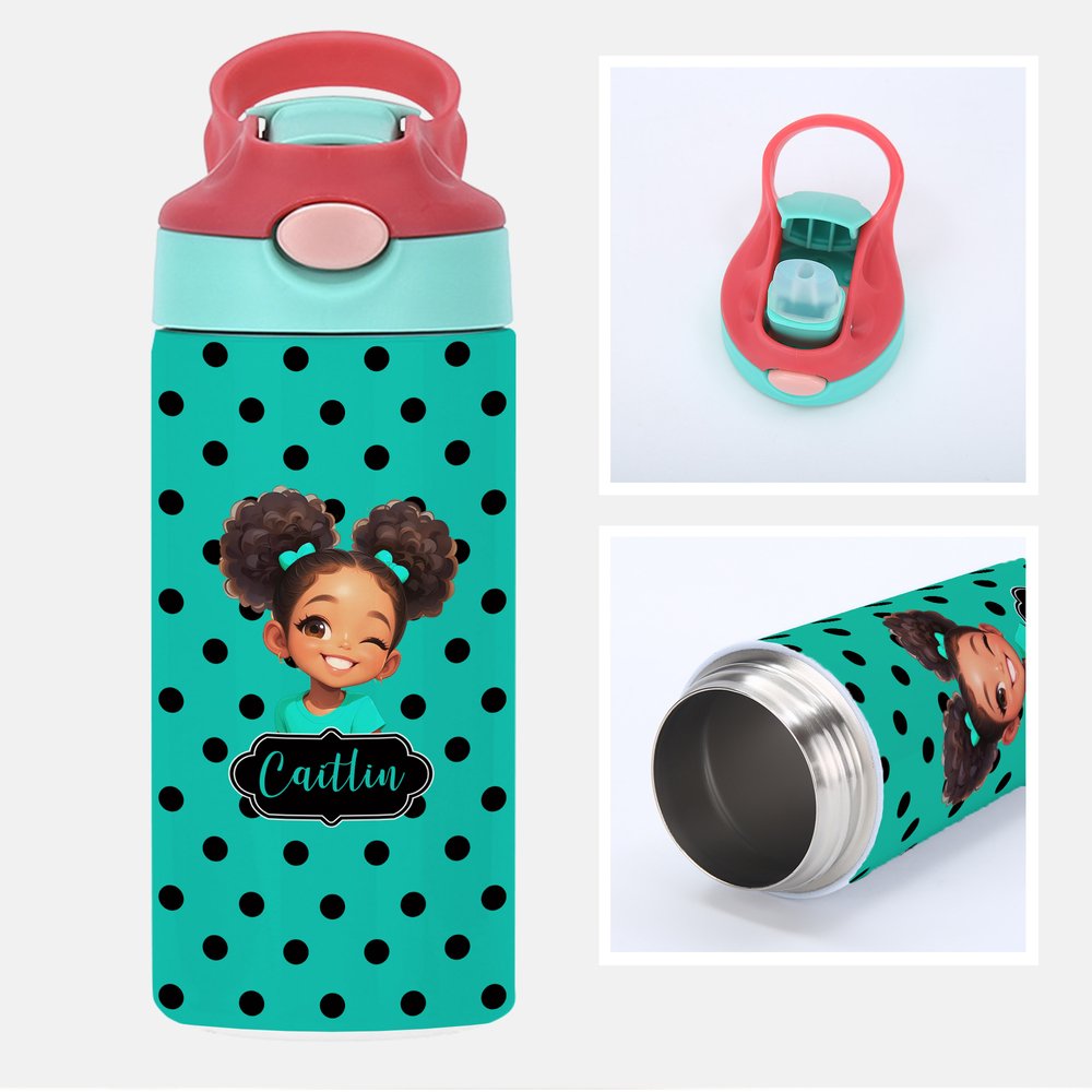 An adorable cartoon girl graphic paired with a bold custom name makes every sip more fun and totally her own. The playful polka dot pattern and multiple character options let her show off her personality with confidence.