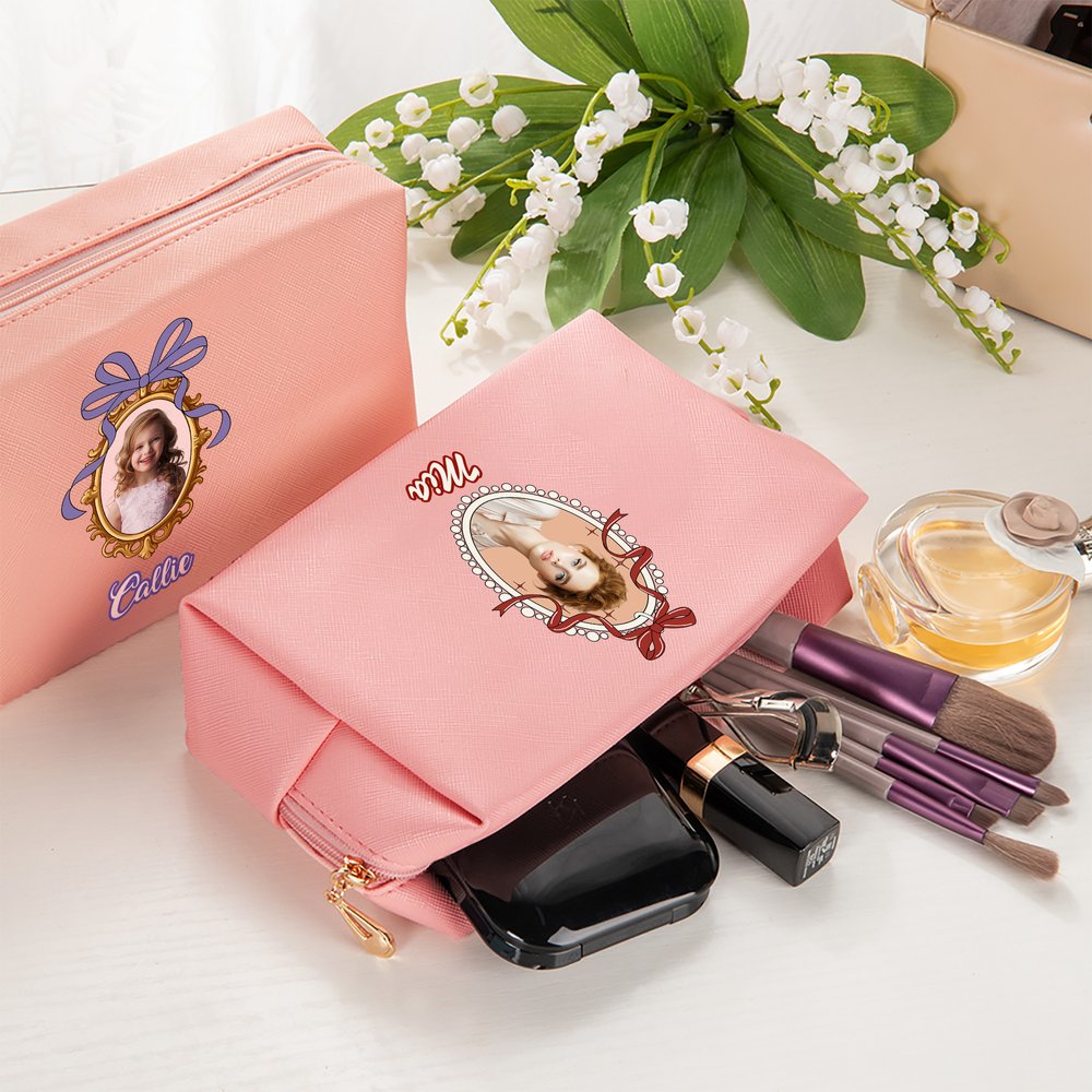 The makeup bag's front side is designed with the pattern of a princess photo frame. The photo frame is outlined with delicate colorful lines and decorated with ribbons for a gorgeous look. Inside the photo frame, you can place your own photos. In addition, the name customization service also makes the makeup bag a unique and exclusive item.
