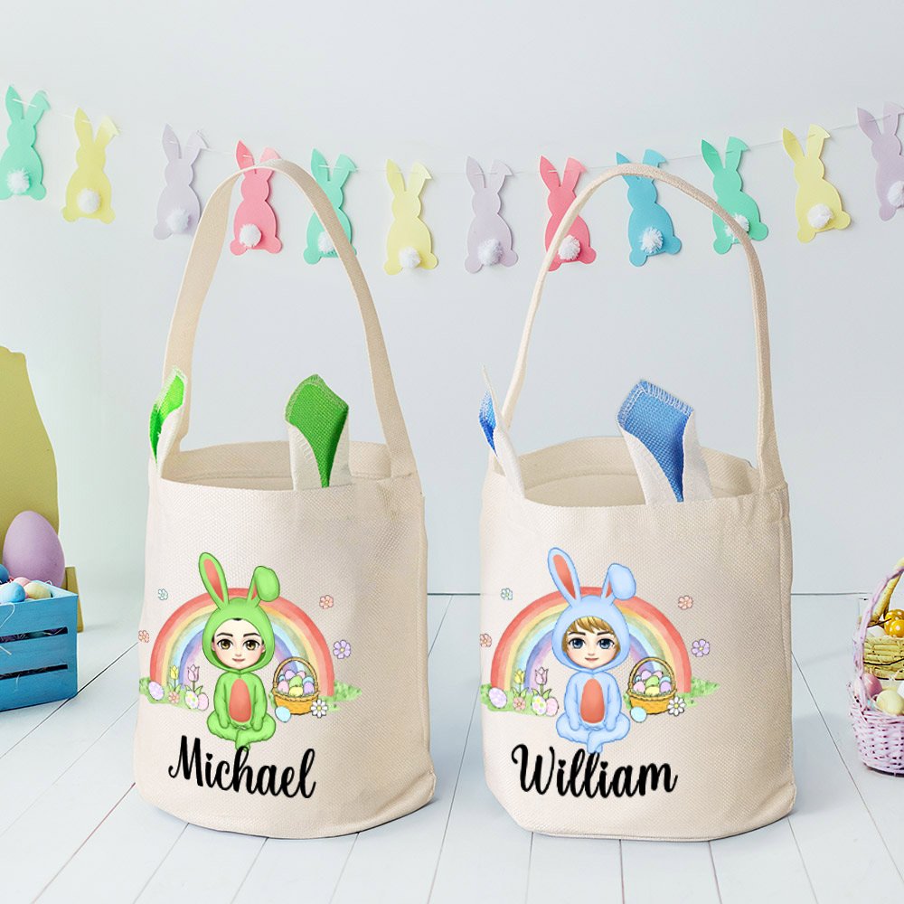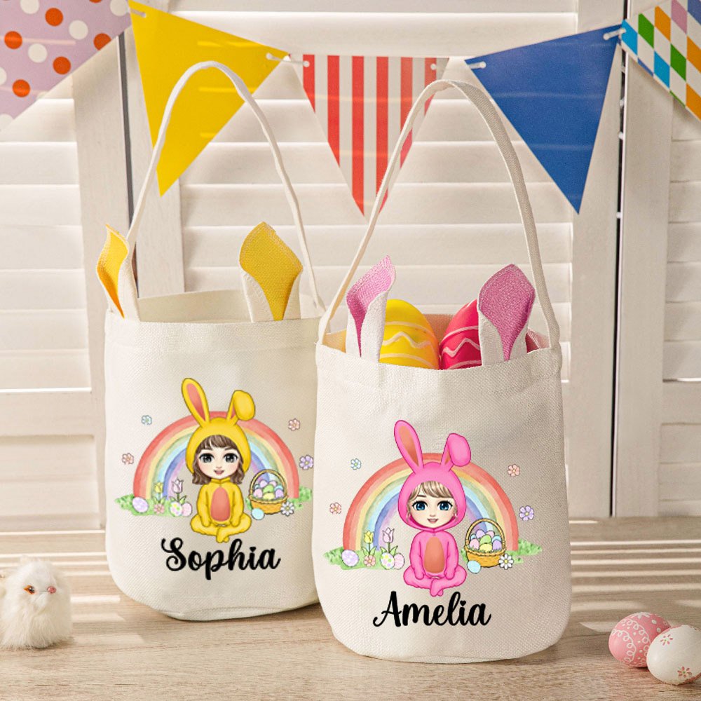 Personalized Rainbow Eggs Bunny Costume Cartoon Character Basket with Name Easter Party Birthday Gift for Boys Girls