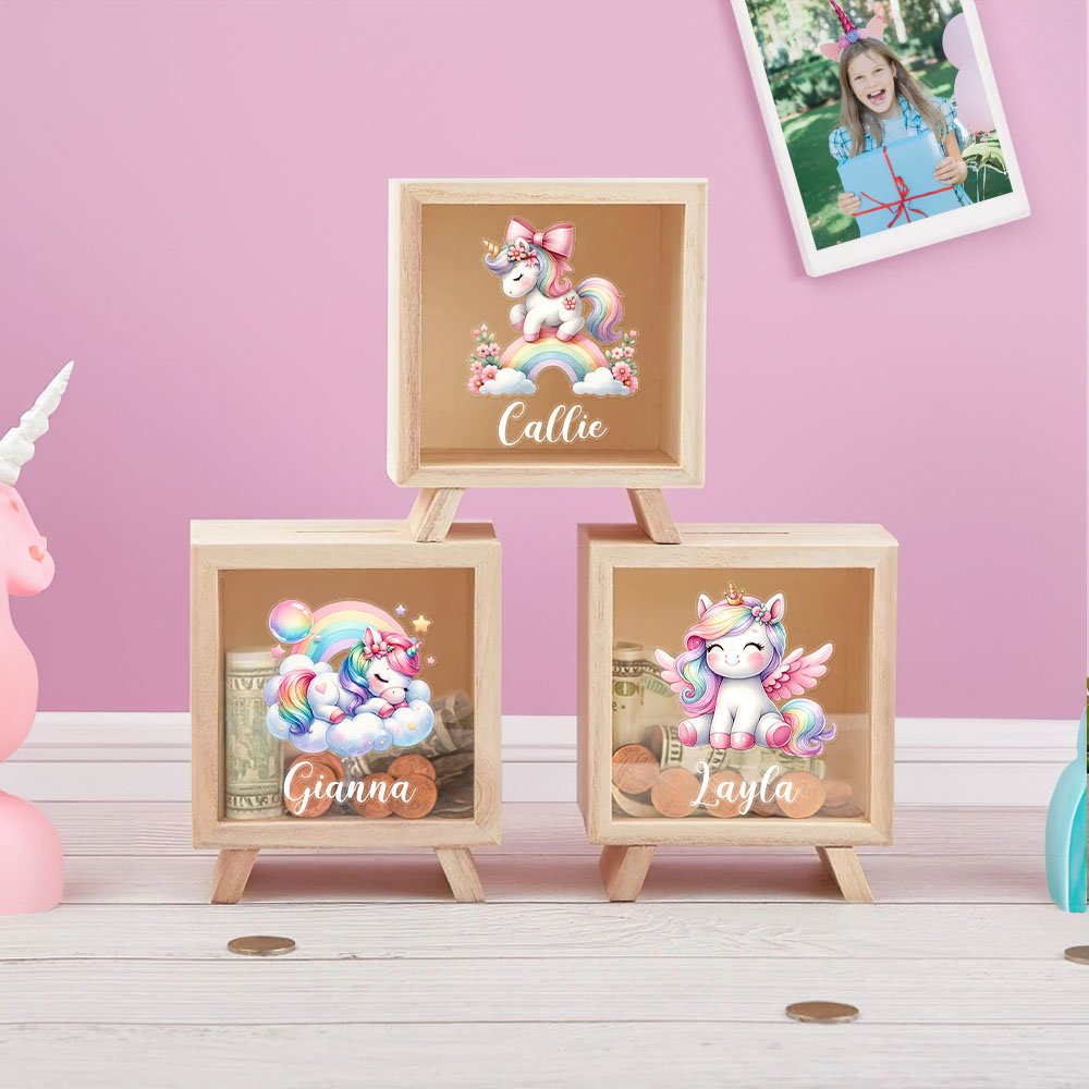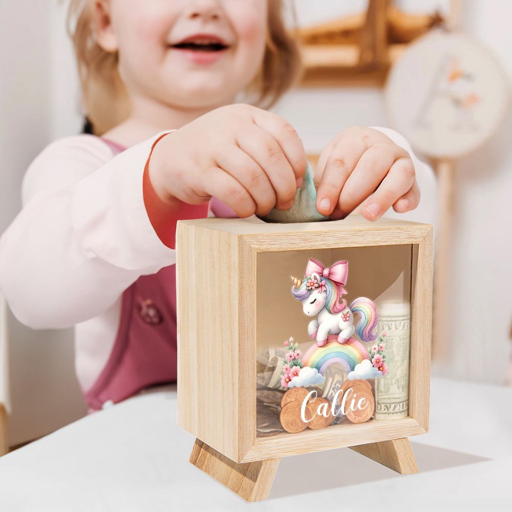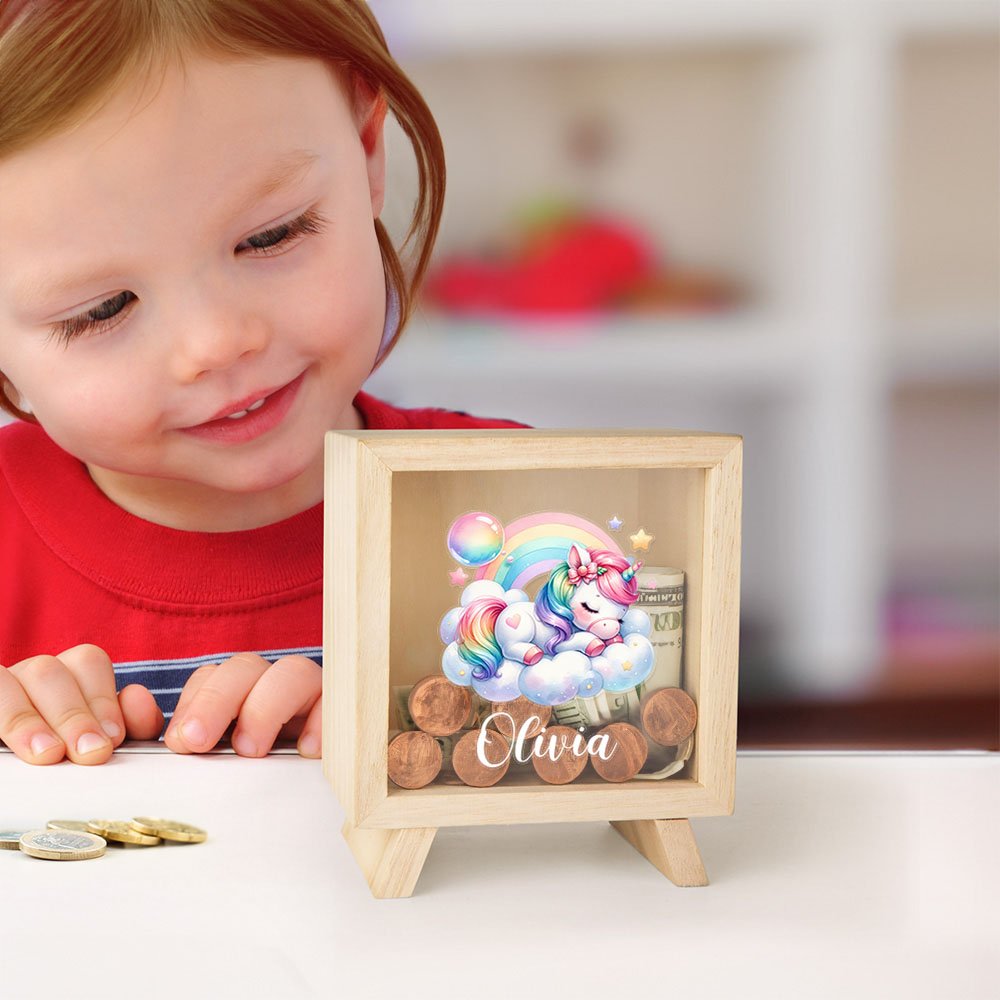 This money box features dreamy unicorns and gorgeous rainbow flower designs that kids will adore. It can be personalized with your child's name, making it a truly special and one-of-a-kind item.