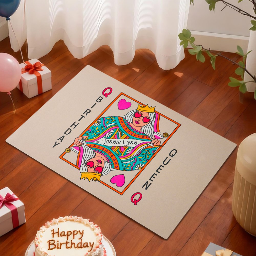 Inspired by the Queen of Hearts in playing cards, this rug incorporates birthday elements to create a stylish queen image. The combination of a crown, sunglasses, and a cocktail adds a playful elegance, blending classic playing card elements with birthday wishes for a unique and eye-catching style.