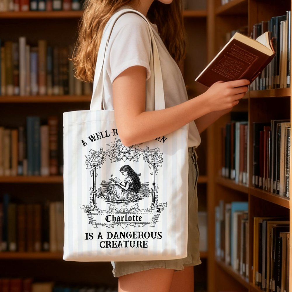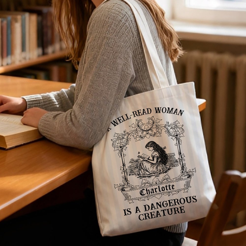 This tote bag features a unique vintage theme and the humorous slogan "A WELL-READ WOMAN IS A DANGEROUS CREATURE". Both sides of the bag feature a girl immersed in reading. You can customize the bag's color, hairstyle, and whether the girl wears glasses, and even have your name intricately printed on the bag, creating a tote that reflects both your literary taste and your personal style.