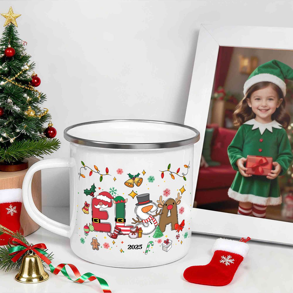 This playful enamel mug combines classic Christmas elements with vibrant rim colors and festive patterns featuring Santa, elves, snowmen, and reindeer. Personalized with a custom name, it transforms into a unique treasure that captures the joy of the season, making it specially endearing for children.