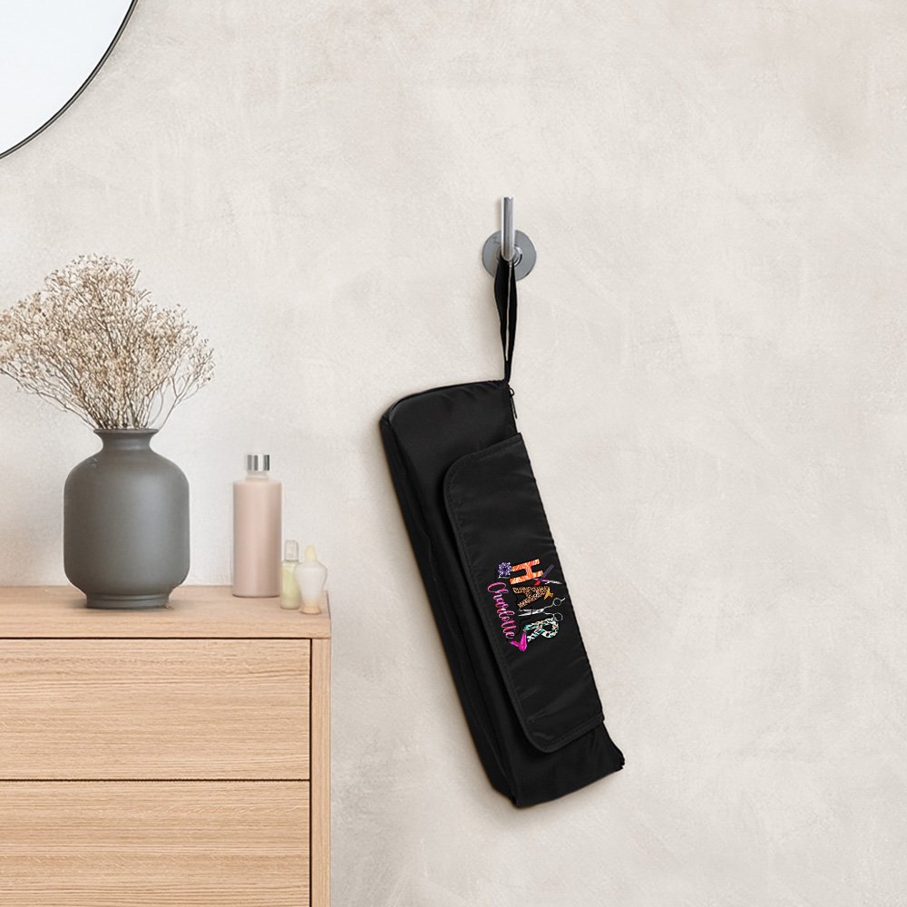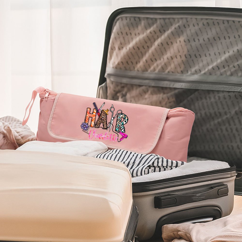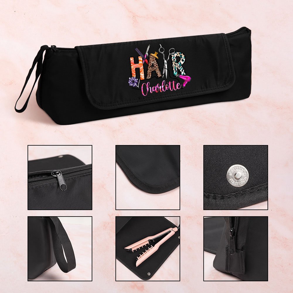 This storage bag's design is creative. The word "Hair" is printed in a leopard print pattern, highlighting the atmosphere of fashion and personality. The surrounding scissors, hairdryer, and flower patterns add a bit of playfulness and cuteness. The bag can also be customized with a name, making each bag a unique piece of art.