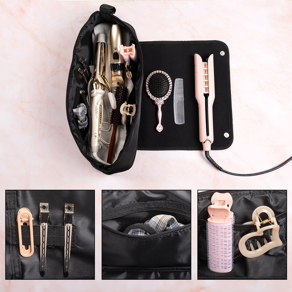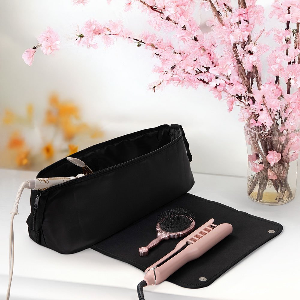This storage bag is made of high-quality fabric to ensure its durability and its water and dust resistance. The high quality of the fabric ensures that the storage bag can withstand daily wear and tear during use, while protecting the internal hair straighteners, electric bars, and other hair tools from moisture and dust, thus extending their service life. The fine sewing and reinforcement also make the storage bag more durable. The storage bag comes with a heat-resistant inner pad, so it can be used to place accessories while they are in use to protect the counter and store them before they cool to ensure personal safety. It also has multiple compartments, which can effectively organize all your hair tools, such as combs, bobby pins, etc., so that everything is neat and accessible.