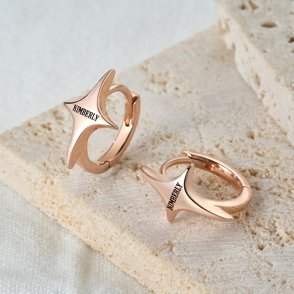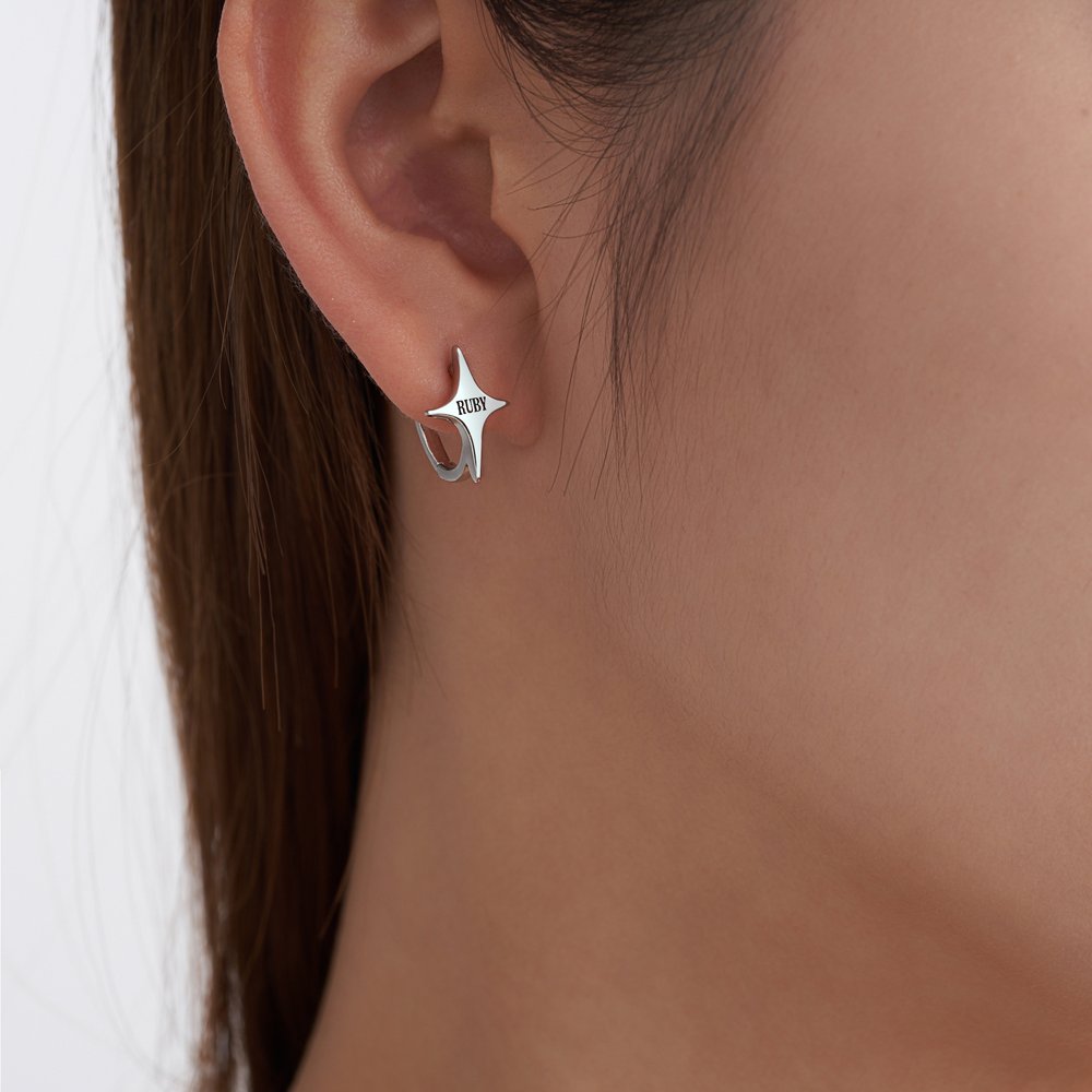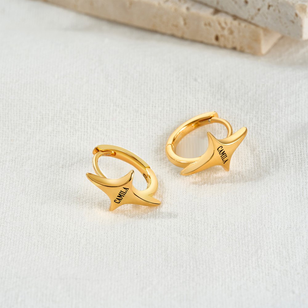 Blending the brilliance of a shooting star with a minimalist aesthetic, the earrings' flowing lines create a star-like silhouette, evoking a simple yet elegant aesthetic. Each earring is meticulously engraved with a personalized name, making these earrings more than just jewelry – they're a unique work of art.