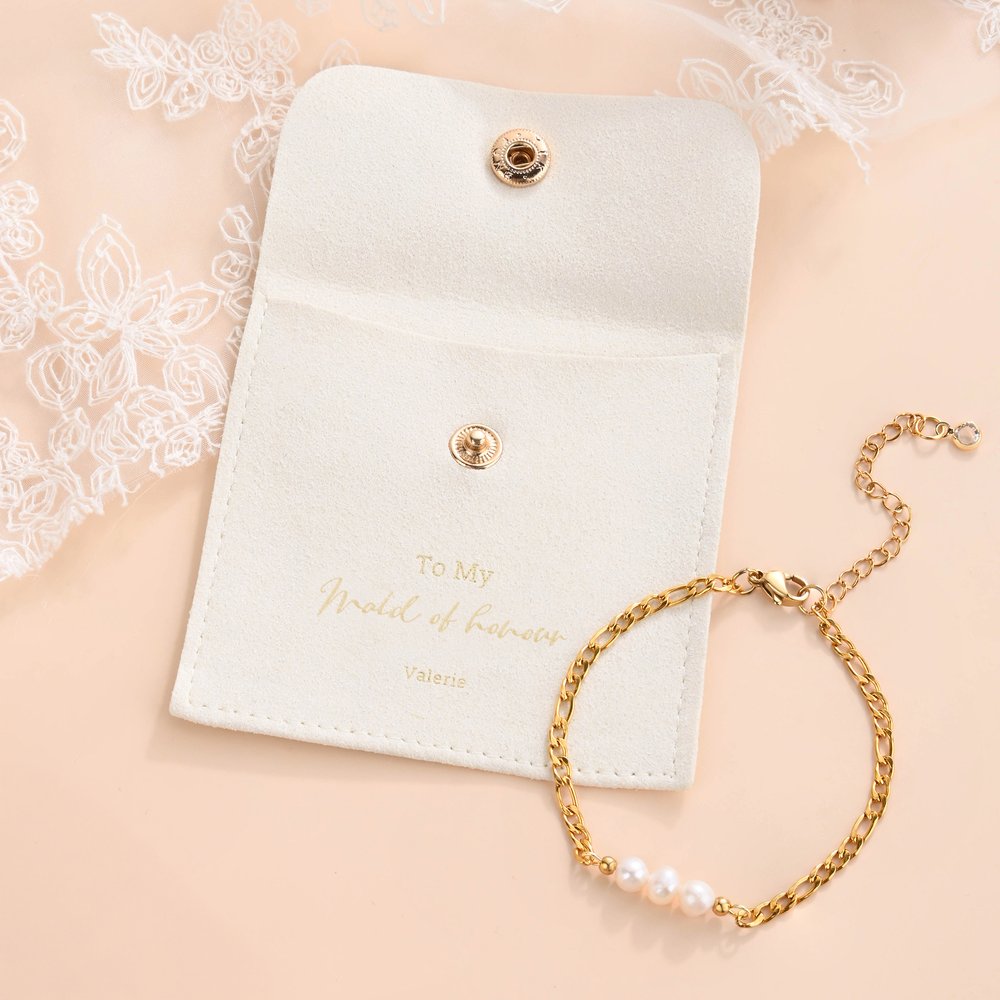 This gorgeous bracelet and earrings set, paired with an exquisite personalized jewelry pouch, is undoubtedly perfect choice for the bride. With white pearls, the bracelet showing its unparalleled elegance and luxury. The earrings are designed with ingenuity to match the bracelet. The jewelry pouch can be personalized with the name to make the gift more memorable.