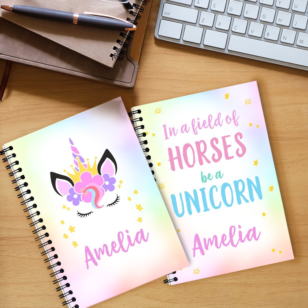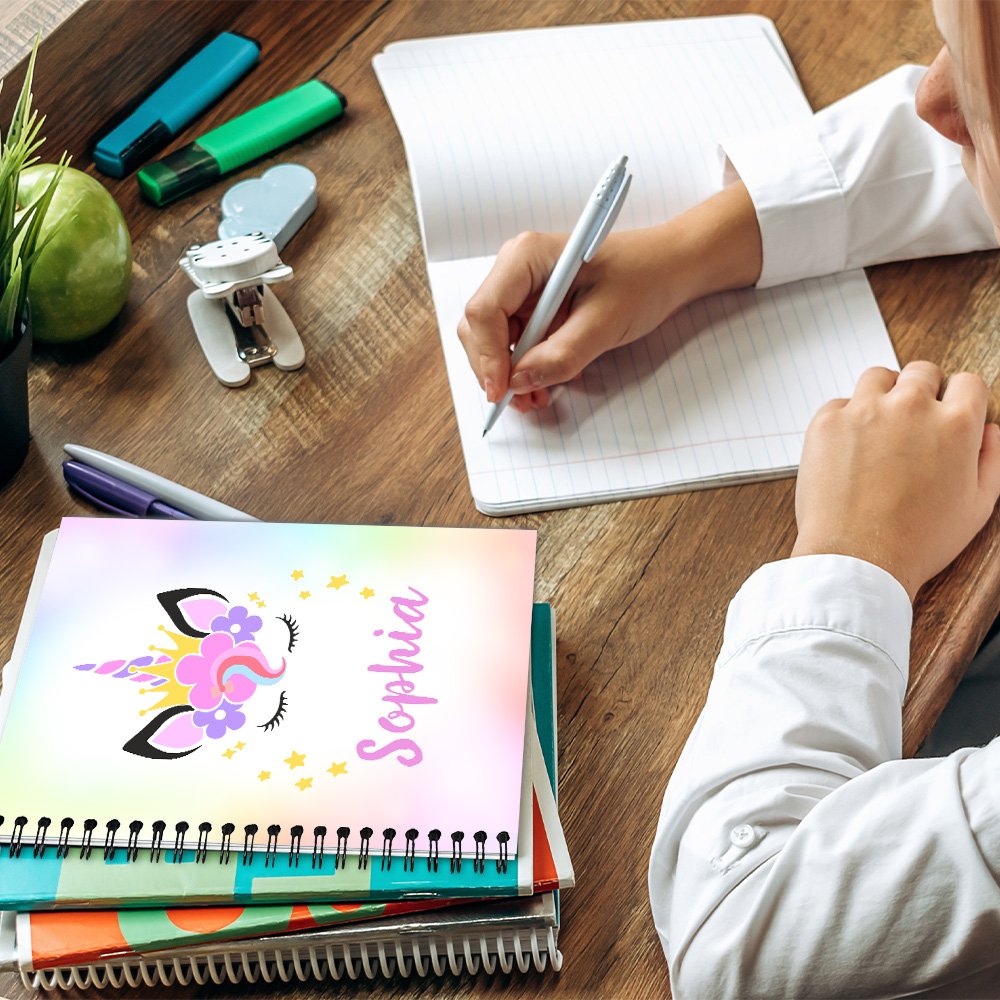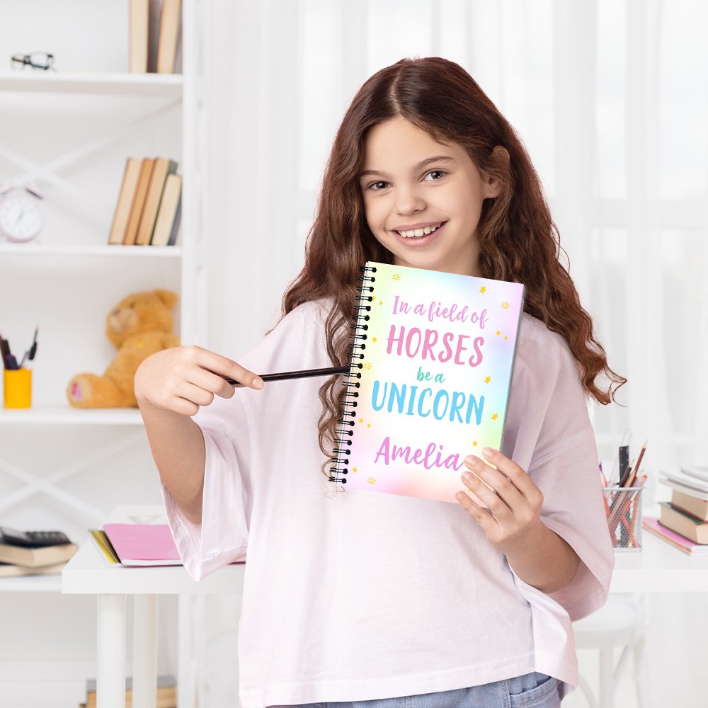Denne utsøkte notatboken har et fantasifullt enhjørningmotiv og tekst på omslaget. Vakre mønstre gir dagboken et personlig preg, og dette unike omslaget med tilpasset tekst gjør notatboken visuelt tiltalende og skaper en meningsfull forbindelse mellom brukeren og dagboken.