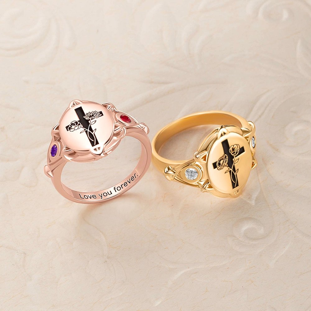 This elegant signet ring features the Star of Bethlehem, two intertwined birth flowers with cross, and two birthstones, symbolizing a deep connection and bond between two individuals. Perfect for representing family, friendship, love, or faith, this design is a heartfelt expression of the ties that bind us to those we cherish most.