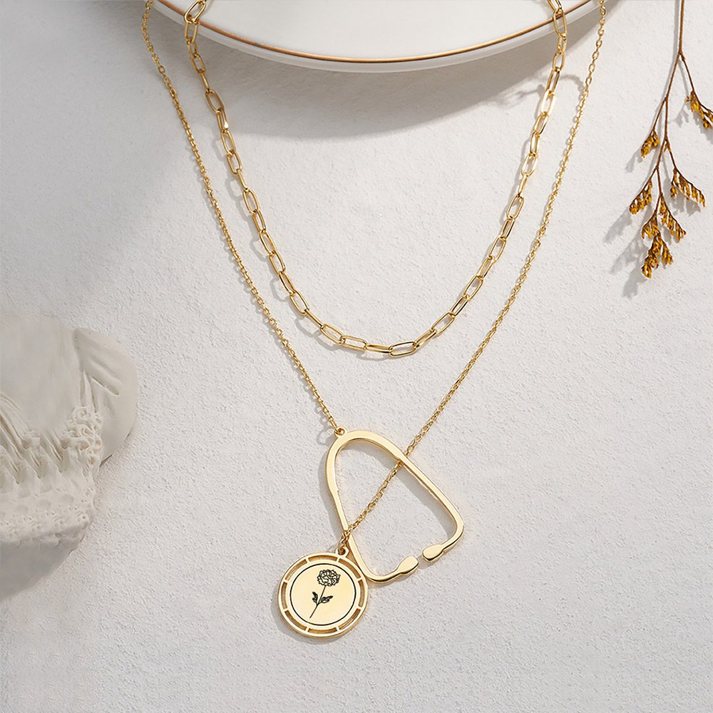 This necklace features a combination chain design, with each piece adorned by an elaborately designed stethoscope pendant and a disk pendant. The disk pendant can be customized with a personalized birth flower, allowing you to create a necklace that is truly one-of-a-kind and uniquely yours.