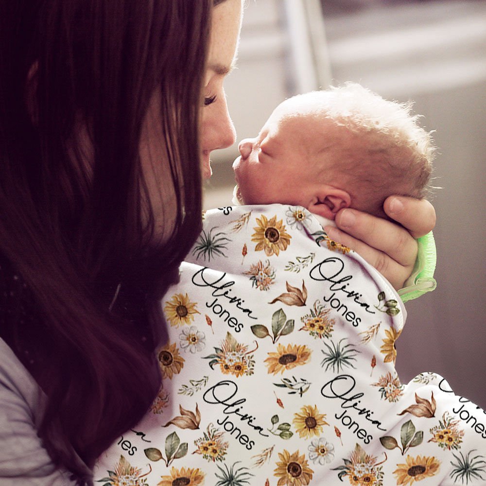 This baby swaddle blanket hat set is printed with cheerful sunflower patterns, implying a positive attitude and a vigorous spirit, symbolizing the sun, light, vitality, and health. It is very suitable for giving to babies. You can customize your child's surname and name among the flowers, making this positive and warm love more unique.