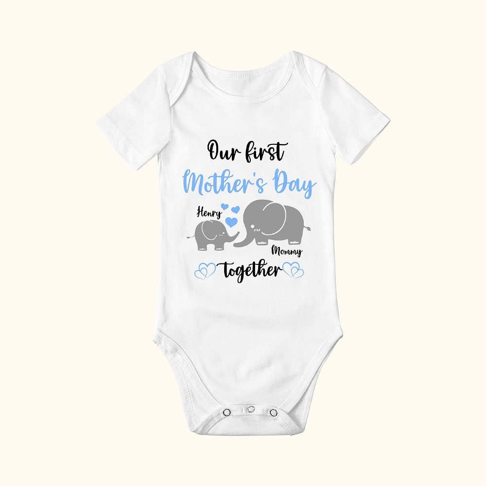 Our baby onesie pattern is of a cute baby elephant and its mother looking at each other face to face, with a loving heart rising in the middle, symbolizing the inseparable relationship between mother and child, showing the warm parent-child time. You can also customize the name to make the baby onesies unique.