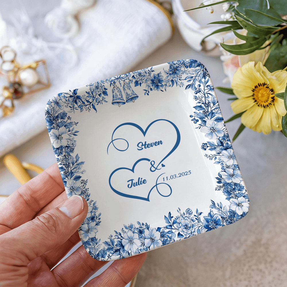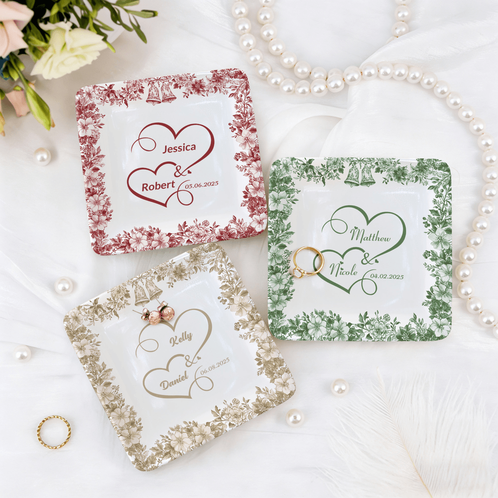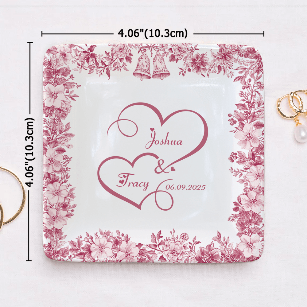 This charming jewelry dish features elegant floral patterns, delicate bells, and heart motifs, all customizable with your names and a significant date. The design beautifully combines aesthetics with personalization, making it a standout piece in any setting.