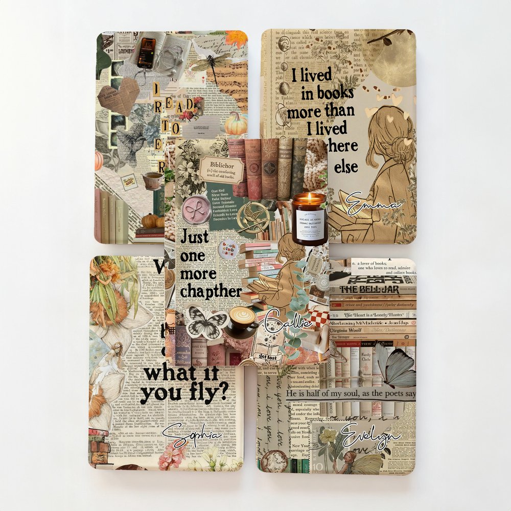 This Kindle case features a handcrafted collage design—blending retro elements like books, candles, butterflies, stamps, illustrated readers, and the playful phrase “Just one more chapter.” It also offers custom name personalization, turning a device protector into a unique, book-lover-themed accessory that reflects a passion for reading and vintage charm.