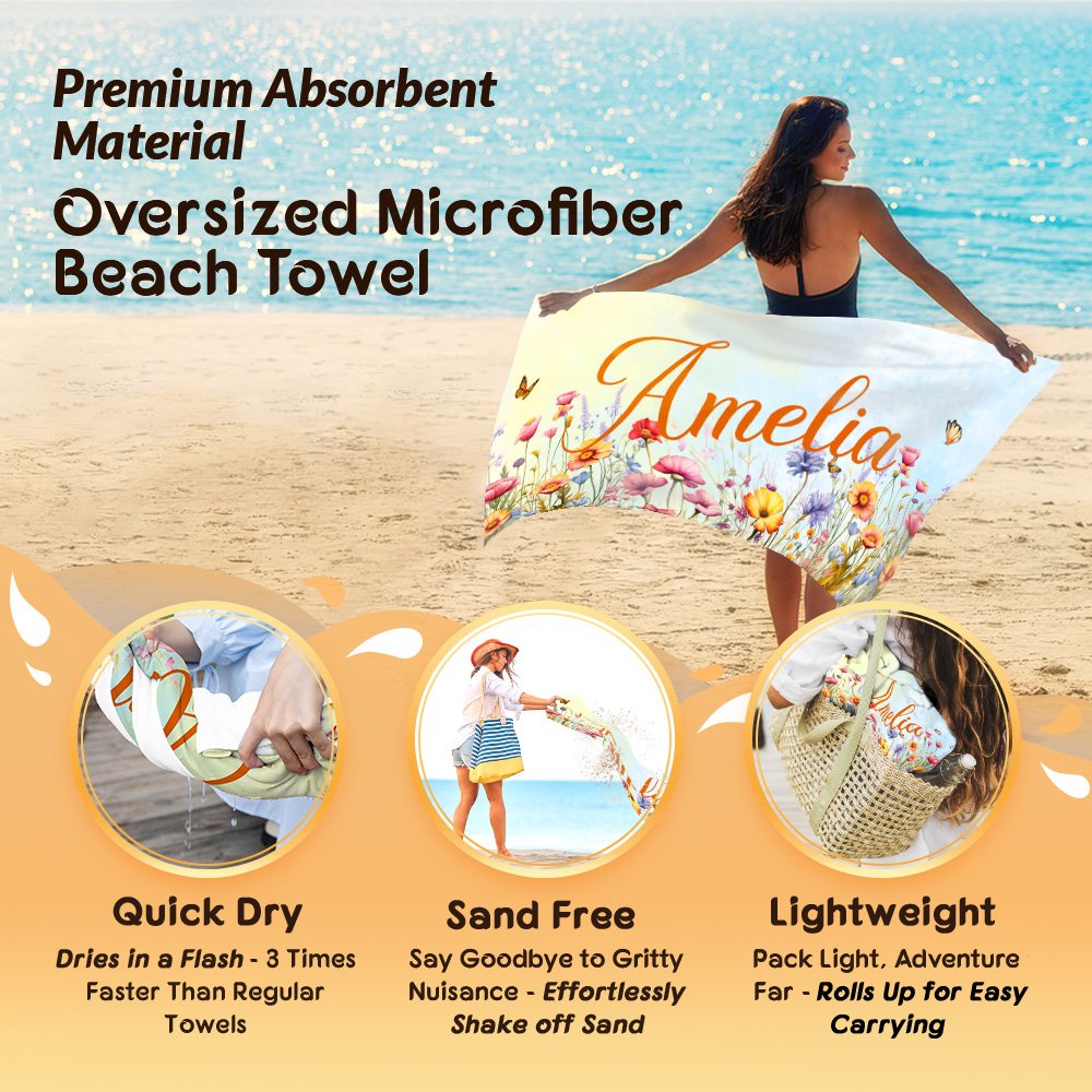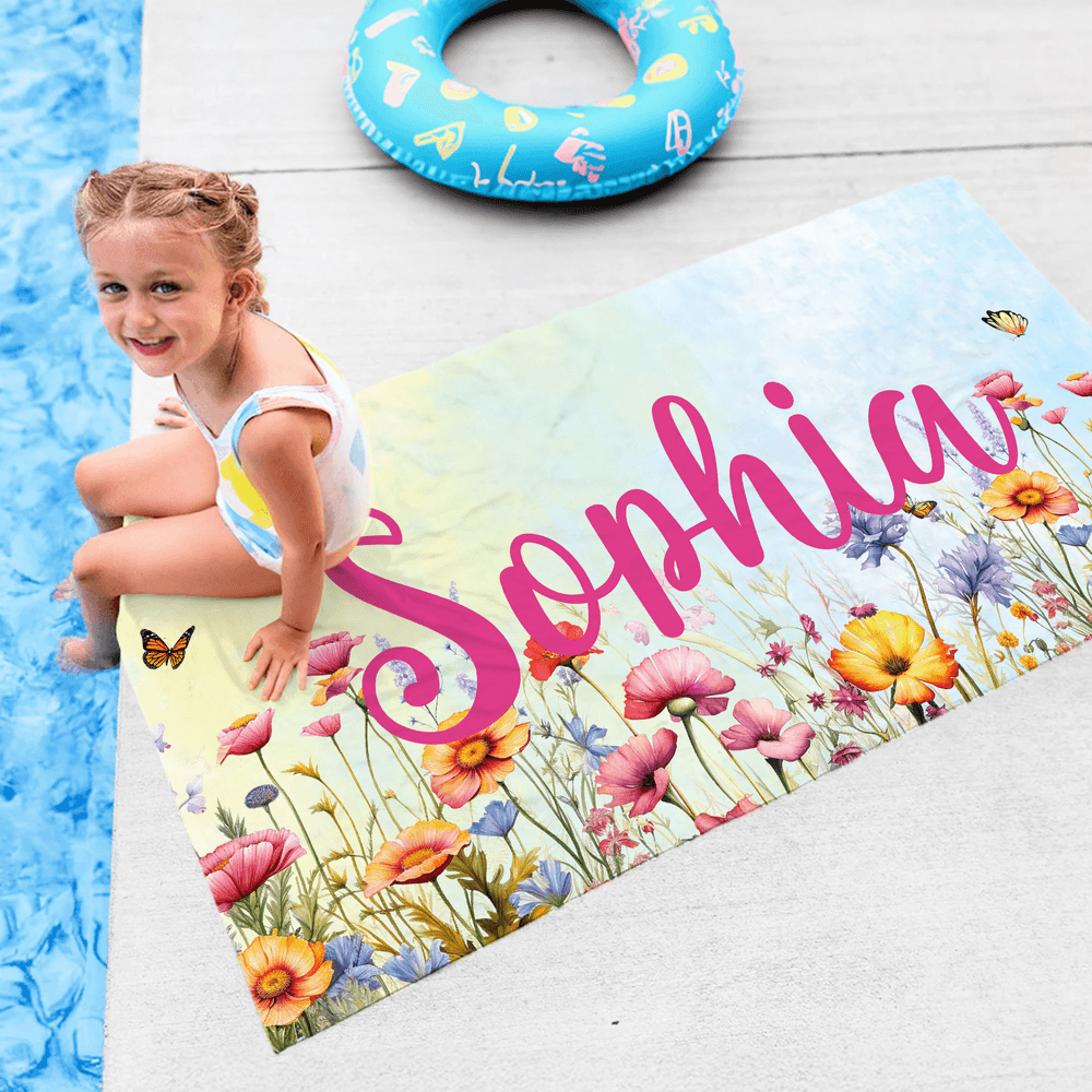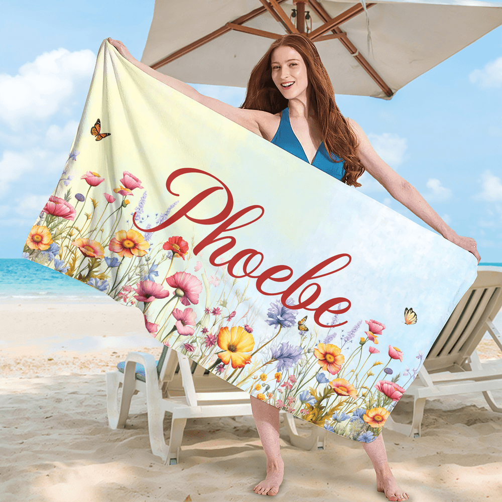 Dette badehåndkleet har akvarellblomster som det viktigste designelementet, supplert med klassiske sommerfuglmotiver og sterke farger, og er svært iøynefallende i sollyset. Det er mulig å tilpasse navnet ditt, noe som gjør hvert badehåndkle til en unik og eksklusiv vare.