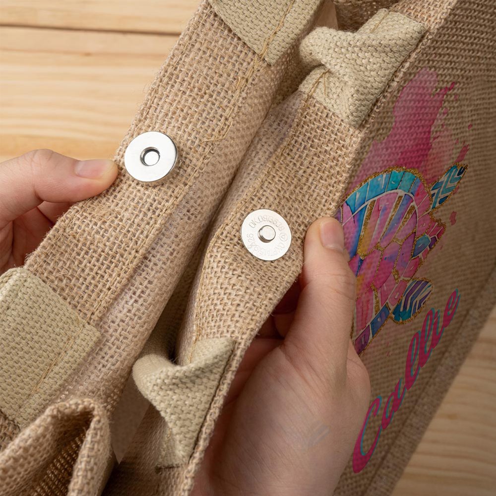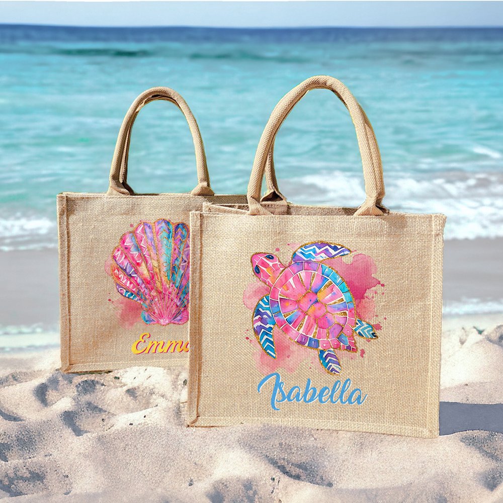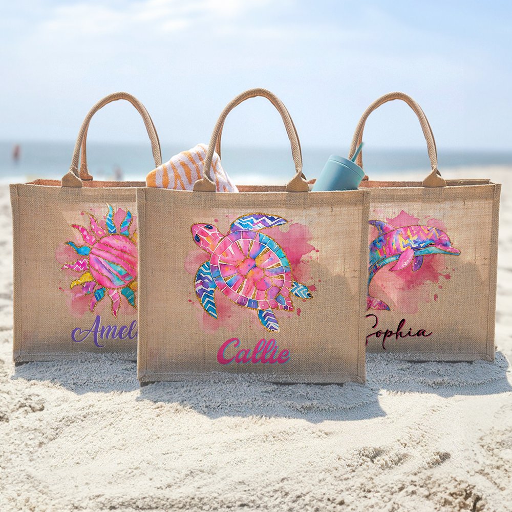 This jute bag presents dreamy Marine elements with watercolor techniques. The gradient pink and purple color scheme is like the sunset reflecting the sea, and it is paired with specially designed cartoon Marine creature patterns of sea turtles, sun dolphins, seahorses, scallops, and starfish. Every detail exudes a free and romantic atmosphere. Add a unique name customization to create a bag with a personal mark.