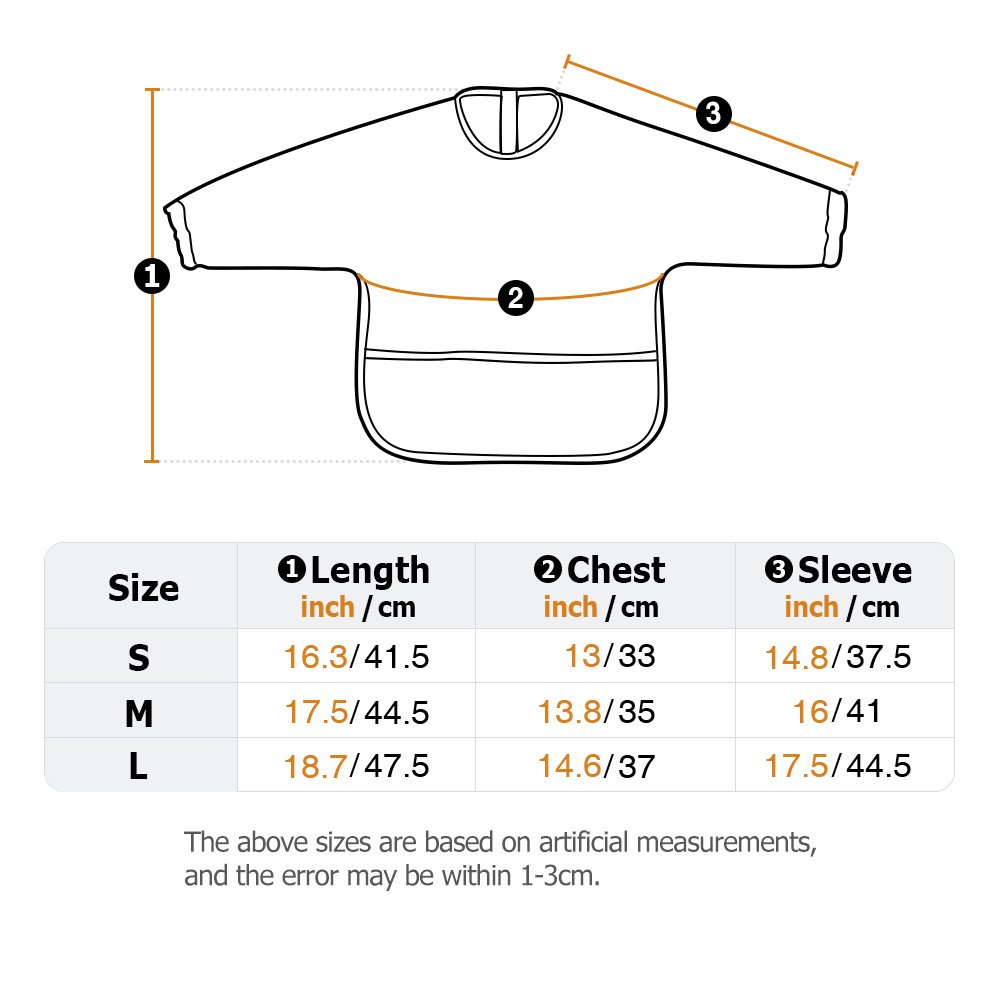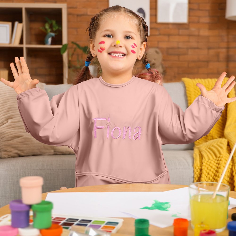 This full-sleeved bib combines practicality with a playful aesthetic. Long sleeves cover the arms and chest for maximum protection. Available in four soft shades of green, blue, copper, and pink, each bib is personalized with name embroidery, enhancing its visual appeal and making each one unique.
